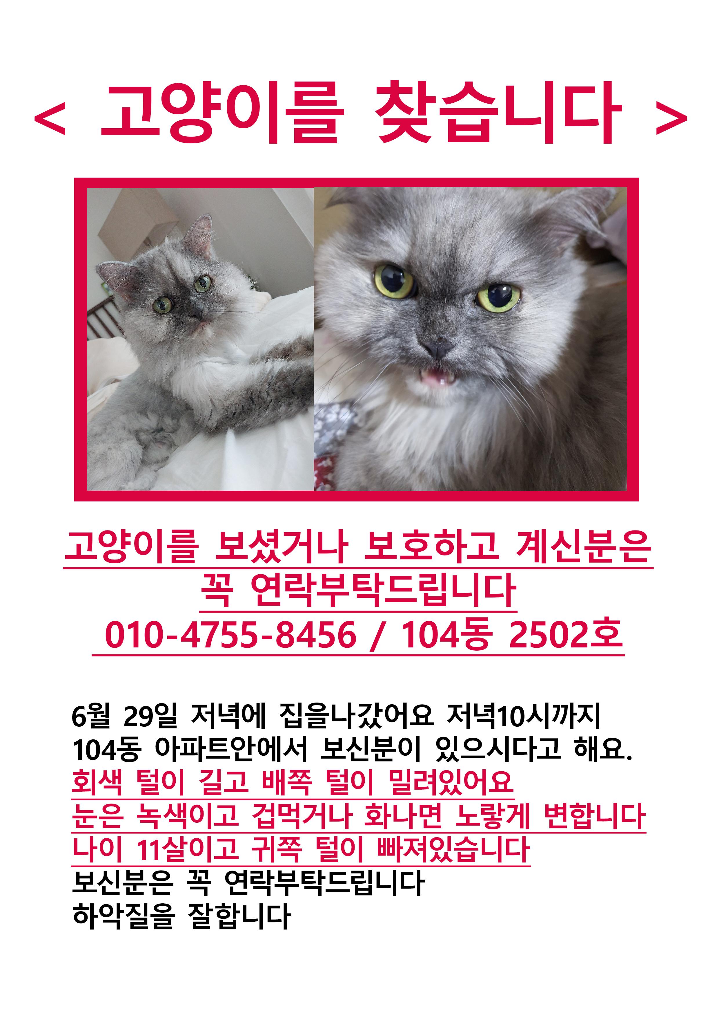 찾아요 🔍고양이 찾아요 경기도 고양이를찾습니다 부탁드립니다 베베양 2023.07.03 - 15:46 9777 이름 베베 종류 및 종 고양이/페르시안친칠라 분실장소 하남감일스윗시티104동 분실 날짜 2023-06-29 성별 암컷(여) 연락처 010-4111-7879 고양이를찾습니다 6월29일 집나가서 30일새벽까지 아파트동안에서 확인되었습니다 혹시 보시거나 보호중이신분이 계시면 꼭 연락부탁드립니다 시간은 아무때나 상관없습니다. 부탁드립니다 Attached file 고양이를찾습니다 부탁드립니다 - 고양이 찾아요 - 유기견 보호 센터 (1) 677.5KB 2 고양이를찾습니다 부탁드립니다 - 고양이 찾아요 - 유기견 보호 센터 (2) 2.19MB 11 공유 베베양 님의 최근 글 작성 글이 없습니다. 베베양 님의 최근 댓글 작성 댓글이 없습니다. 글쓴이의 작성글 감추기 댓글 쓰기 에디터 사용하기 닫기 글쓴이 비밀번호 댓글 등록 view_headline 목록