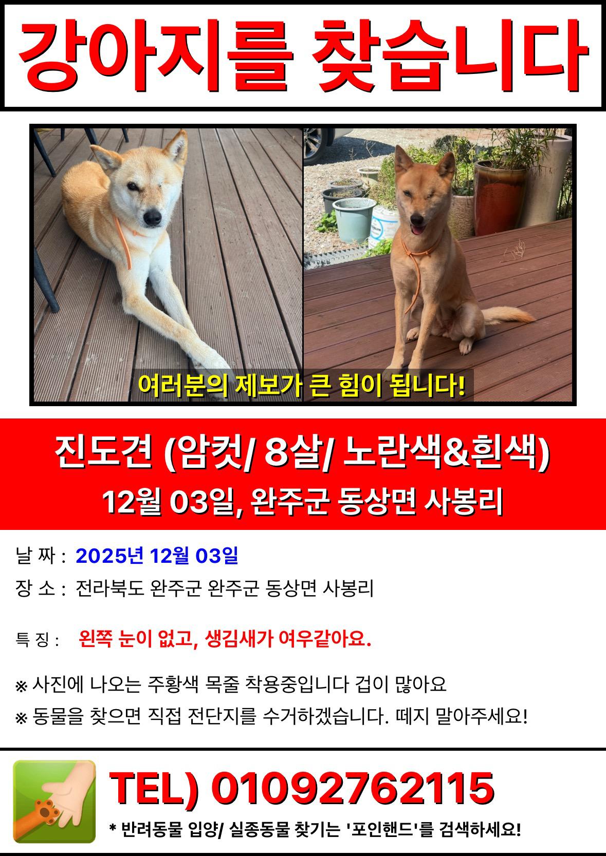 • 왼쪽 눈 없는 진돗개 누렁이 찾아요