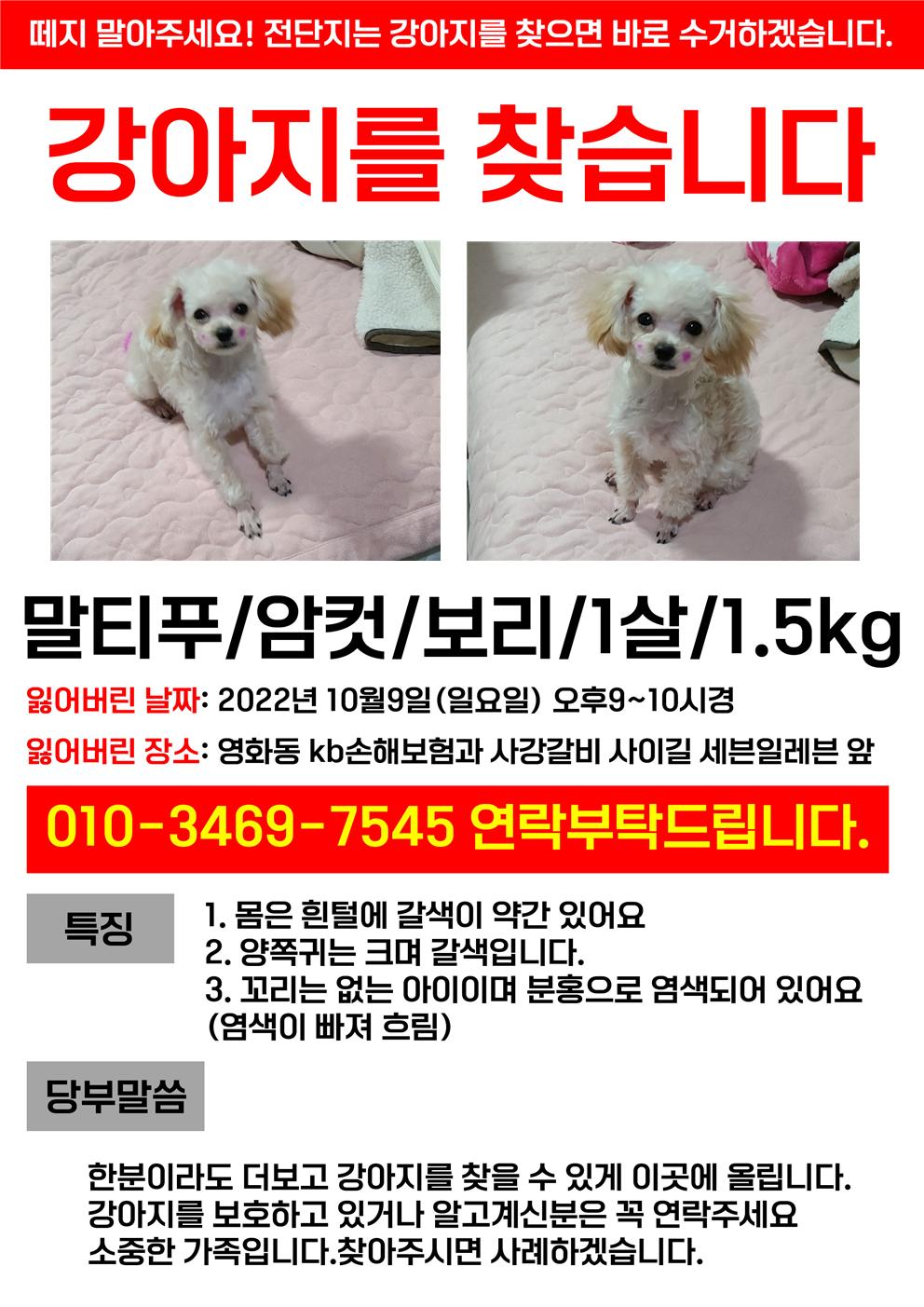 찾아요 🔍강아지 찾아요 경기도 () 영화동 보리를 찾습니다 보리언니 2022.10.10 - 22:53 2022.10.10 - 22:53 26011 이름 보리 종류 및 종 말티푸 믹스견 분실장소 영화동 분실 날짜 2022-10-09 성별 암컷(여) 연락처 010-3747-7545 강아지를 찾습니다 엄마가 많이 힘들어하세요 ㅜㅜ Attached file 영화동 보리를 찾습니다 - 강아지 찾아요 - 유기견 보호 센터 (1) 197.5KB 6 영화동 보리를 찾습니다 - 강아지 찾아요 - 유기견 보호 센터 (2) 675.2KB 0 영화동 보리를 찾습니다 - 강아지 찾아요 - 유기견 보호 센터 (3) 739.5KB 8 공유 보리언니 님의 최근 글 작성 글이 없습니다. 보리언니 님의 최근 댓글 작성 댓글이 없습니다. 글쓴이의 작성글 감추기 댓글 쓰기 에디터 사용하기 닫기 글쓴이 비밀번호 댓글 등록 view_headline 목록