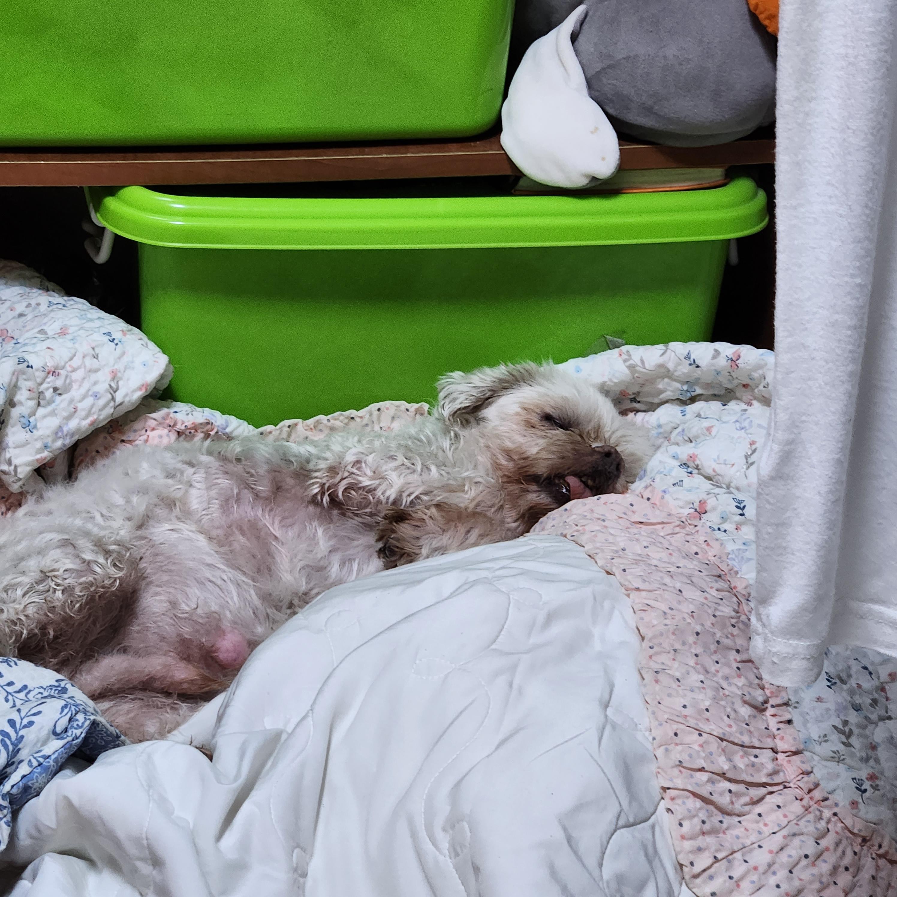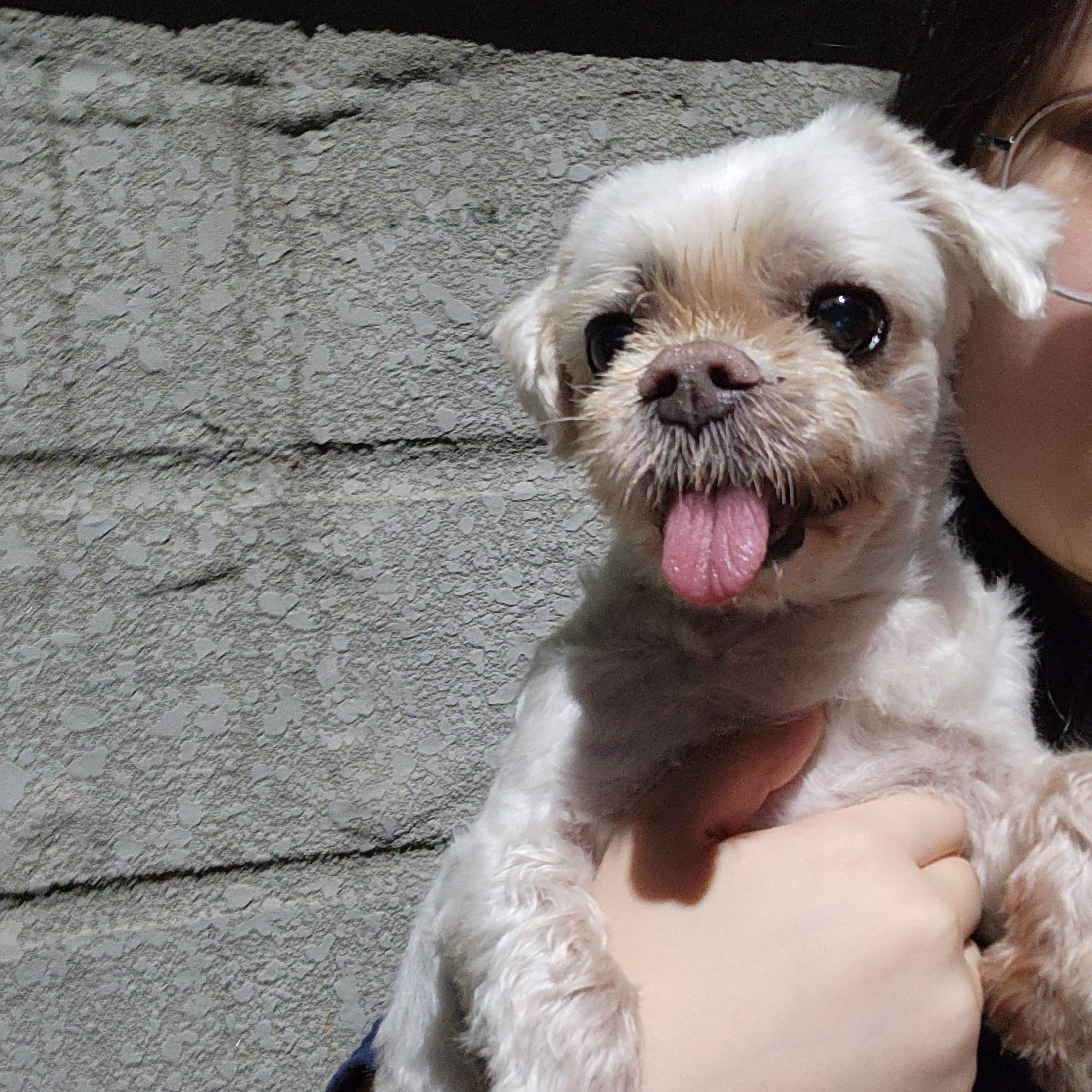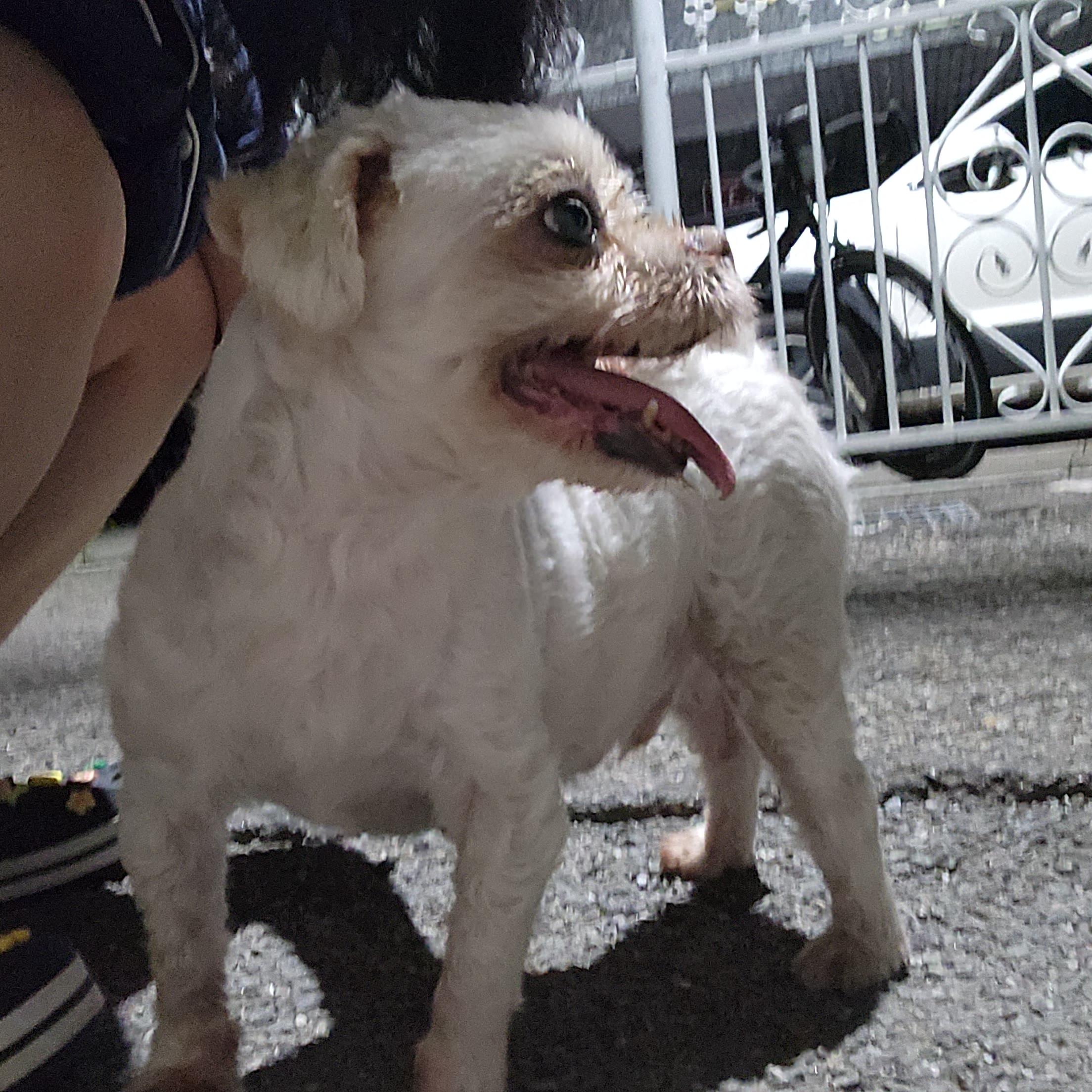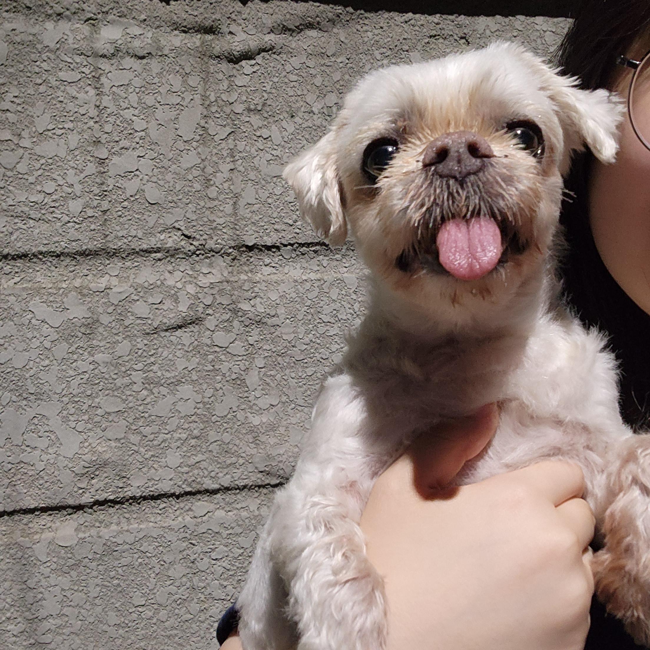 좀 뚱뚱하고, 털이 곱슬거리며, 좀 꼬질꼬질한 상태입니다. 미용 후, 털이 조금 긴 편이고, 귀가 안좋아서 붉고 습해요. 혀는 계속 내밀고 다니고, 코가 건조한 편입니다.