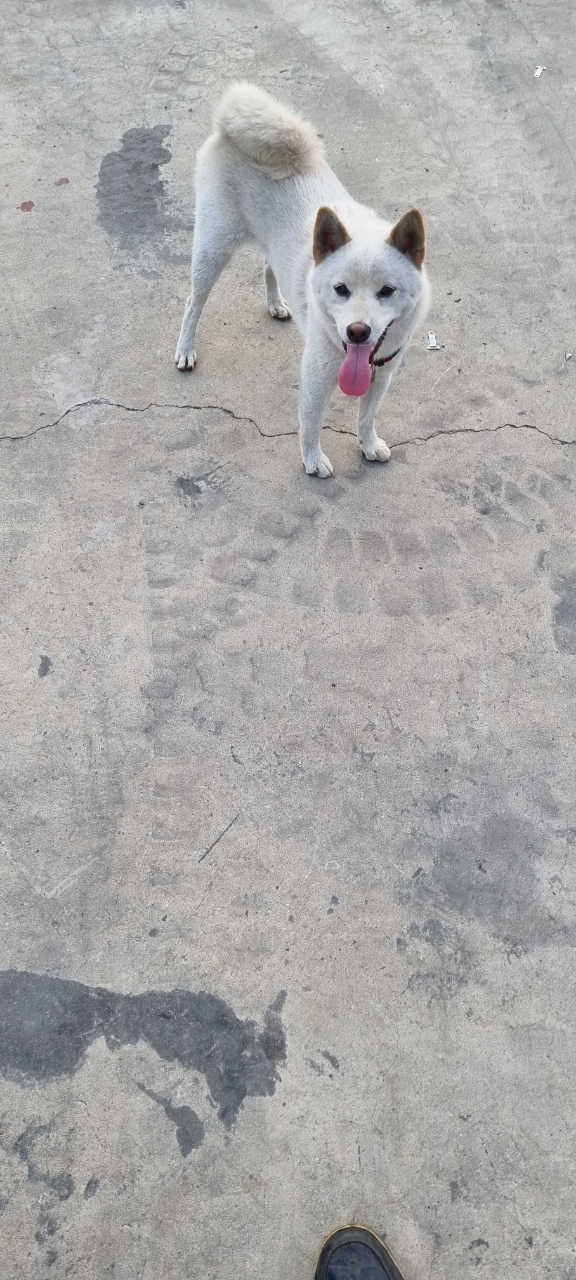 흰색의 백시바구요 진도개와 같은 외형에 꼬리가 돼지