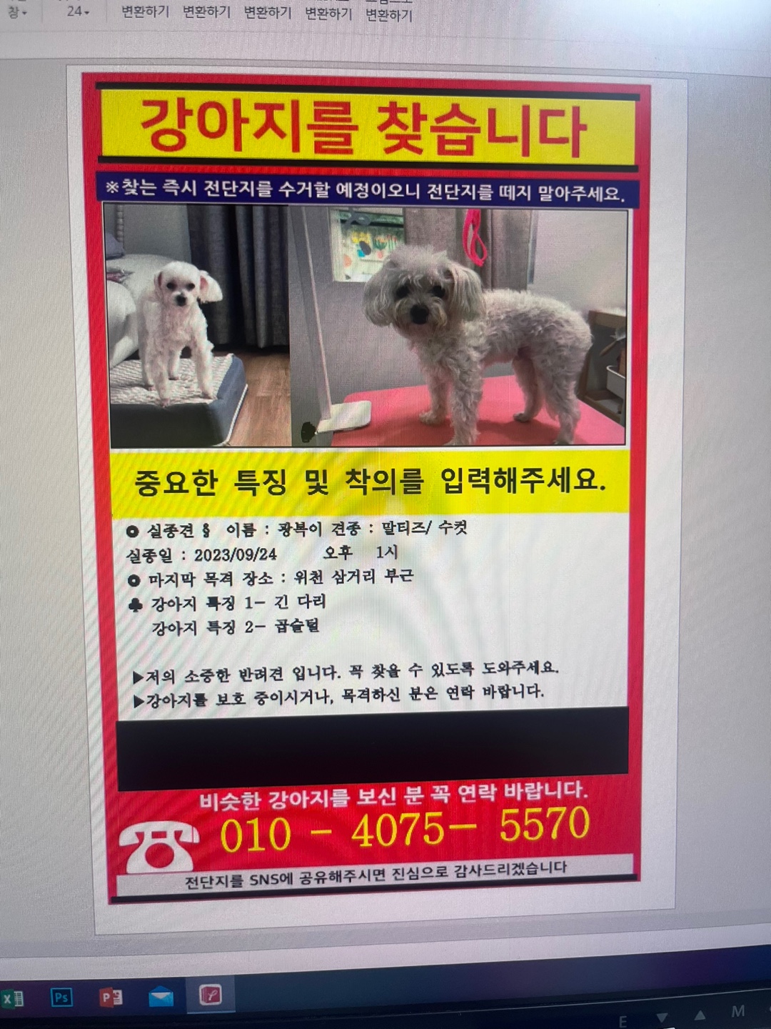 찾아요 🔍강아지 찾아요 경북 () 제발 광복이좀찾아주세요 광복이 2023.10.05 - 17:08 2023.09.25 - 15:35 3505 3 이름 광복이 종류 및 종 강아지/말티즈 분실장소 대구경북 위천삼거리부근 분실 날짜 2023-09-24 성별 수컷(남) 연락처 010-4075-5570 Attached file 제발 광복이좀찾아주세요 - 강아지 찾아요 - 유기견 보호 센터 (1) 311.6KB 0 제발 광복이좀찾아주세요 - 강아지 찾아요 - 유기견 보호 센터 (2) 557.4KB 1 공유 광복이 님의 최근 글 작성 글이 없습니다. 광복이 님의 최근 댓글 작성 댓글이 없습니다. 글쓴이의 작성글 감추기 댓글3 0 Hani 비회원은 댓글을 볼 수 없습니다 2023.10.01 - 06:57 #220947 0 Hani 비회원은 댓글을 볼 수 없습니다 2023.10.01 - 07:02 #220951 1 0 광복이 비회원은 댓글을 볼 수 없습니다 2023.10.05 - 17:08 #221434 댓글 쓰기 에디터 사용하기 닫기 글쓴이 비밀번호 댓글 등록 view_headline 목록