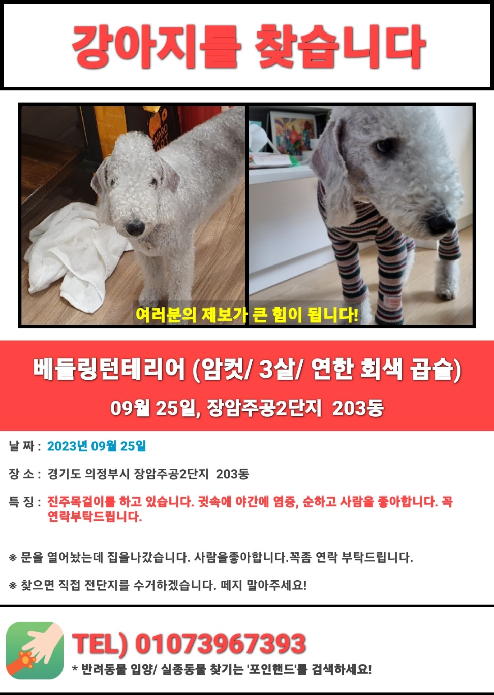찾아요 🔍강아지 찾아요 경기도 () 진주목걸이를 하고있습니다. 하늘과비 2023.09.27 - 12:23 2023.09.26 - 16:22 3320 이름 망고 종류 및 종 강아지 /베링턴테리어 분실장소 의정부 장암2단지 내 문이열려서 나갔습니다 분실 날짜 2023-09-25 성별 암컷(여) 연락처 010-7396-7393 ⁸ Attached file 진주목걸이를 하고있습니다. - 강아지 찾아요 - 유기견 보호 센터 (1) 357.7KB 5 진주목걸이를 하고있습니다. - 강아지 찾아요 - 유기견 보호 센터 (2) 168.6KB 10 진주목걸이를 하고있습니다. - 강아지 찾아요 - 유기견 보호 센터 (3) 299.7KB 1 공유 하늘과비 님의 최근 글 작성 글이 없습니다. 하늘과비 님의 최근 댓글 작성 댓글이 없습니다. 글쓴이의 작성글 감추기 댓글 쓰기 에디터 사용하기 닫기 글쓴이 비밀번호 댓글 등록 view_headline 목록