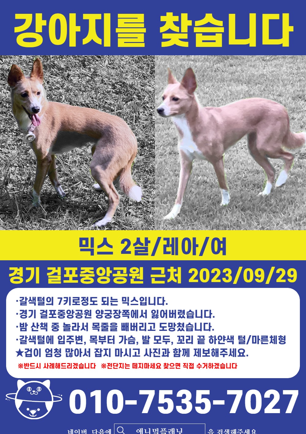 찾아요 🔍강아지 찾아요 경기도 () 믹스 2살 여아 실종(제보가 간절합니다) 하마킥 2023.09.30 - 04:39 2385 이름 레아 종류 및 종 믹스 분실장소 경기도 김포시 걸포동, 걸포중앙공원 분실 날짜 2023-09-29 성별 암컷(여) 연락처 010-칠오삼오-칠027 Attached file 믹스 2살 여아 실종(제보가 간절합니다) - 강아지 찾아요 - 유기견 보호 센터 (1) 477.5KB 11 공유 하마킥 님의 최근 글 작성 글이 없습니다. 하마킥 님의 최근 댓글 작성 댓글이 없습니다. 글쓴이의 작성글 감추기 댓글 쓰기 에디터 사용하기 닫기 글쓴이 비밀번호 댓글 등록 view_headline 목록