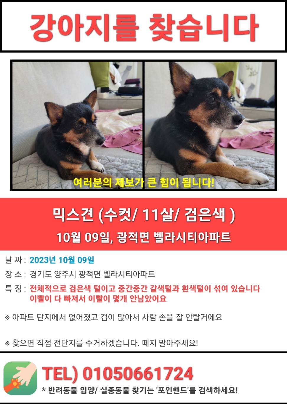 찾아요 🔍강아지 찾아요 경기도 () 강아지 찾습니다 mbu0110 2023.10.11 - 12:27 2023.10.10 - 15:33 3408 1 이름 희망이 종류 및 종 믹스견 분실장소 경기 양주시 벨라시티아파트 분실 날짜 2023-10-09 성별 수컷(남) 연락처 010-4046-1726 11살 믹스견입니다 이가 다빠져서 양쪽송곳니가 밖으로 드러나있습니다 겁이많습니다 Attached file 강아지 찾습니다 - 강아지 찾아요 - 유기견 보호 센터 (1) 306.8KB 1 공유 mbu0110 님의 최근 글 작성 글이 없습니다. mbu0110 님의 최근 댓글 작성 댓글이 없습니다. 글쓴이의 작성글 감추기 댓글1 0 mbu0110 비회원은 댓글을 볼 수 없습니다 2023.10.11 - 12:27 #222324 댓글 쓰기 에디터 사용하기 닫기 글쓴이 비밀번호 댓글 등록 view_headline 목록