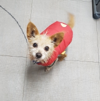 빨간옷입은 강아지 찾아요.