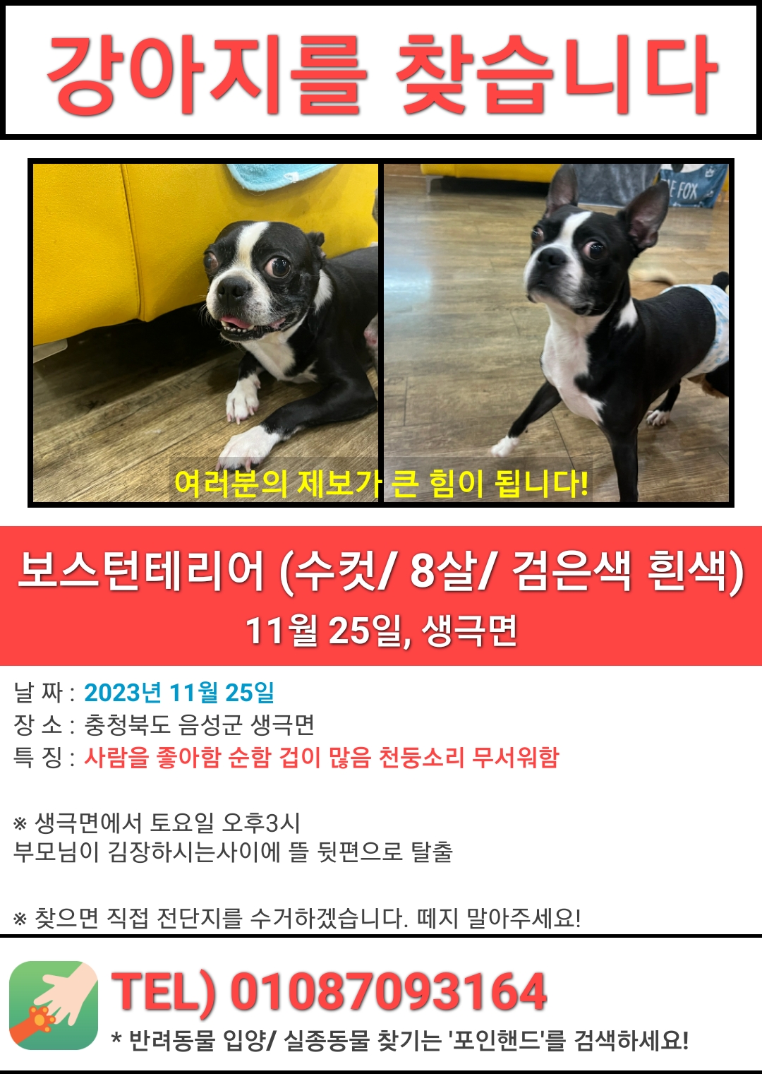 충북 음성 생극에서 잃어버린 보스턴테리어 찾습니다 - 강아지 찾아요 - 유기견 보호 센터 - 이미지 1