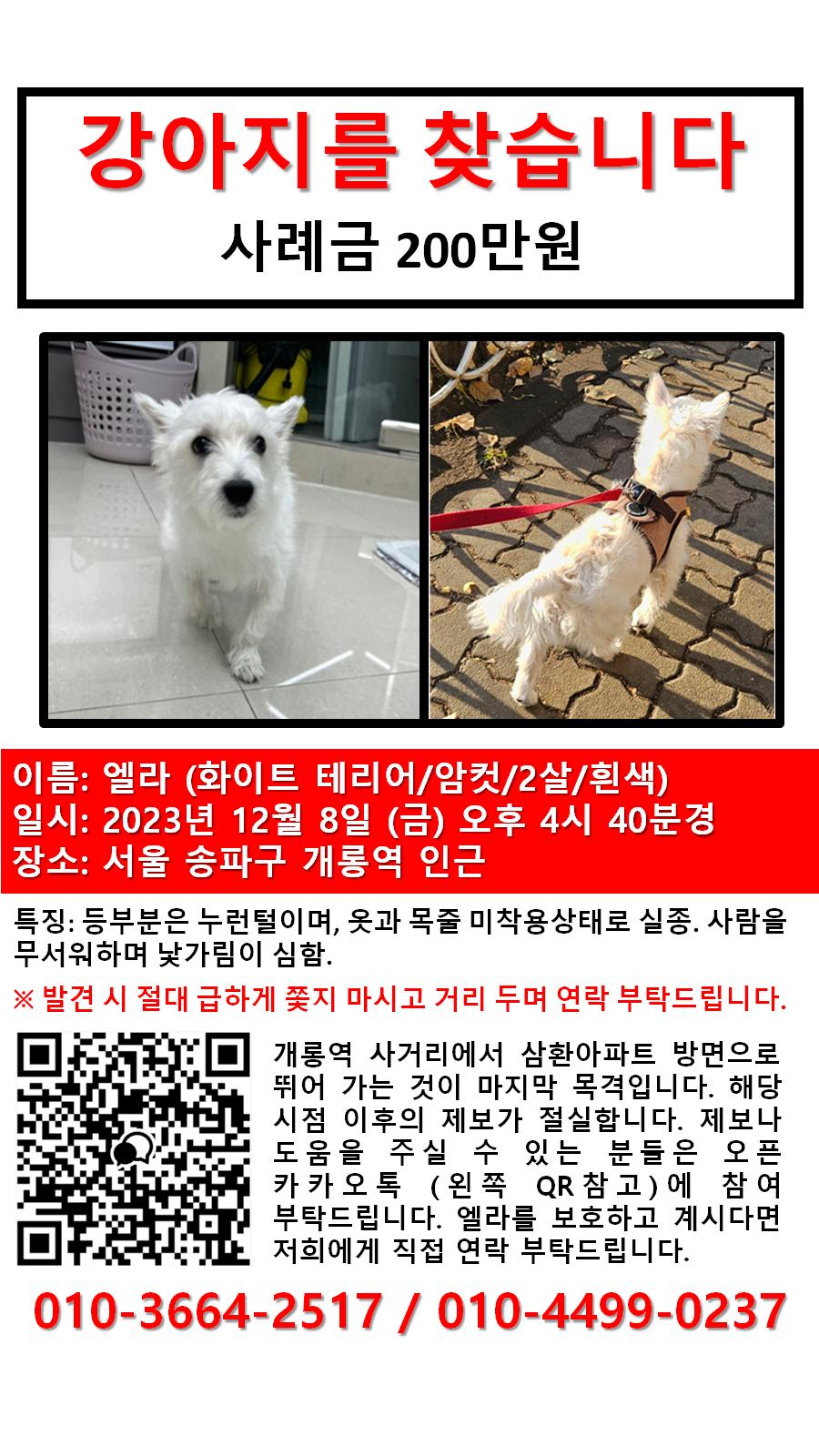 찾아요 🔍강아지 찾아요 서울 () 화이트테리어 찾아요 !!!!!!! poom 2023.12.10 - 20:32 2023.12.09 - 20:08 1793 이름 엘라 종류 및 종 화이트테리어 분실장소 서울시 송파구 5호선(개롱역) 인근 분실 날짜 2023-12-08 성별 암컷(여) 연락처 010-3664-2517 Attached file 화이트테리어 찾아요 !!!!!!! - 강아지 찾아요 - 유기견 보호 센터 (1) 242.6KB 5 공유 poom 님의 최근 글 작성 글이 없습니다. poom 님의 최근 댓글 작성 댓글이 없습니다. 글쓴이의 작성글 감추기 댓글 쓰기 에디터 사용하기 닫기 글쓴이 비밀번호 댓글 등록 view_headline 목록