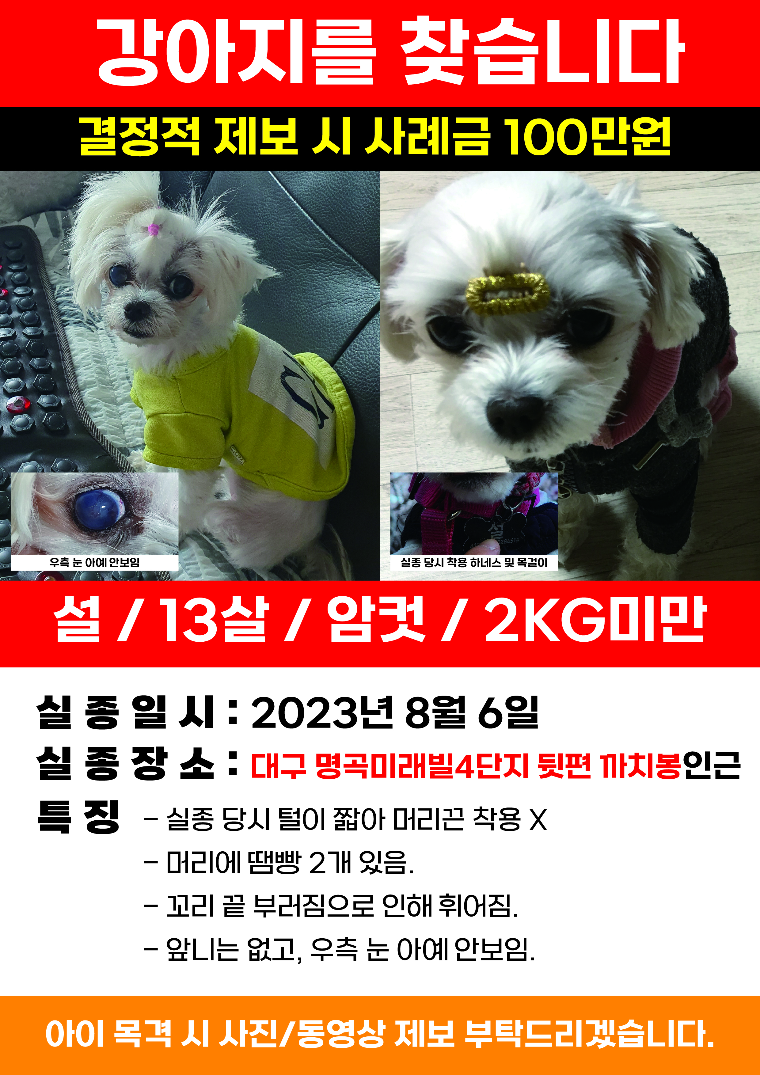 사례금100)한번씩만 봐주시고 도와주세요.. 23년 8월 6일에 잃어버린 1.8kg의 신발사이즈 240 크기의 말티즈 설을 찾습니다...