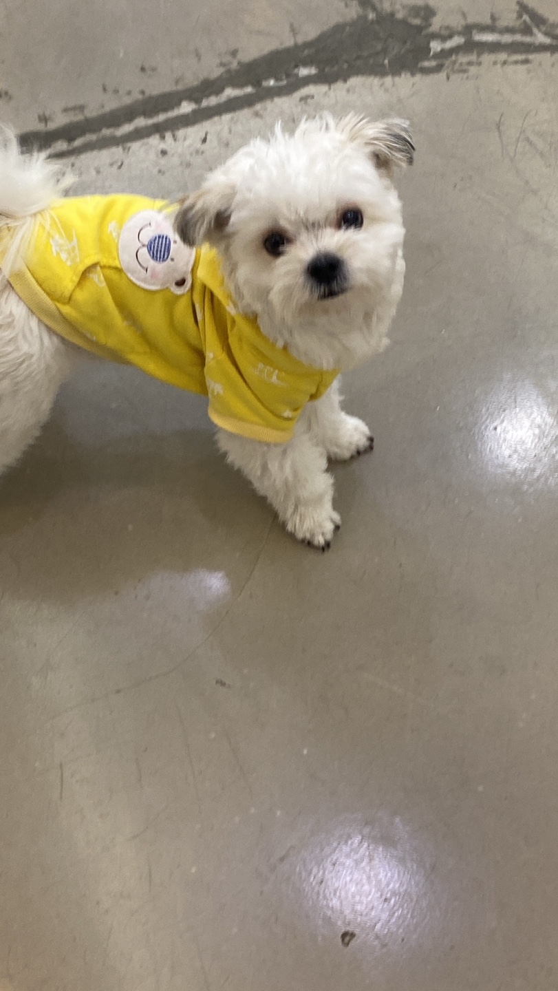 흰색 말티즈(귀만 연한 갈색) 1살이며 사람보다 강아지를 더 좋아해 강아지를 쫒아갈 수 있습니다.