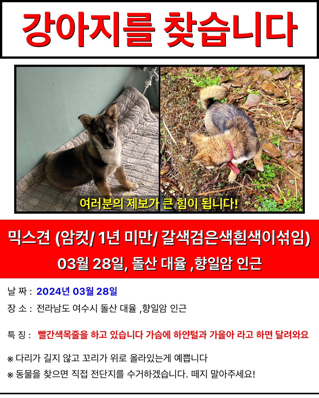🚨여수시 향일암 ,대율인근에서 강아지를 찾습니다🚨