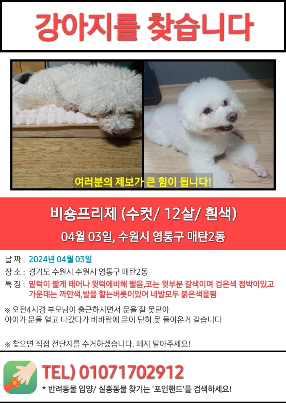 찾아요 🔍강아지 찾아요 완료-찾음 () 강아지를 찾습니다 동동이이모 2024.04.04 - 20:51 2024.04.04 - 11:25 402 이름 동동이 종류 및 종 비숑프리제 분실장소 수원시 매탄동 성별 수컷(남) 연락처 010-9214-9145 Attached file 강아지를 찾습니다 - 강아지 찾아요 - 유기견 보호 센터 (1) 315.5KB 9 공유 동동이이모 님의 최근 글 작성 글이 없습니다. 동동이이모 님의 최근 댓글 작성 댓글이 없습니다. 글쓴이의 작성글 감추기 댓글 쓰기 에디터 사용하기 닫기 글쓴이 비밀번호 댓글 등록 view_headline 목록