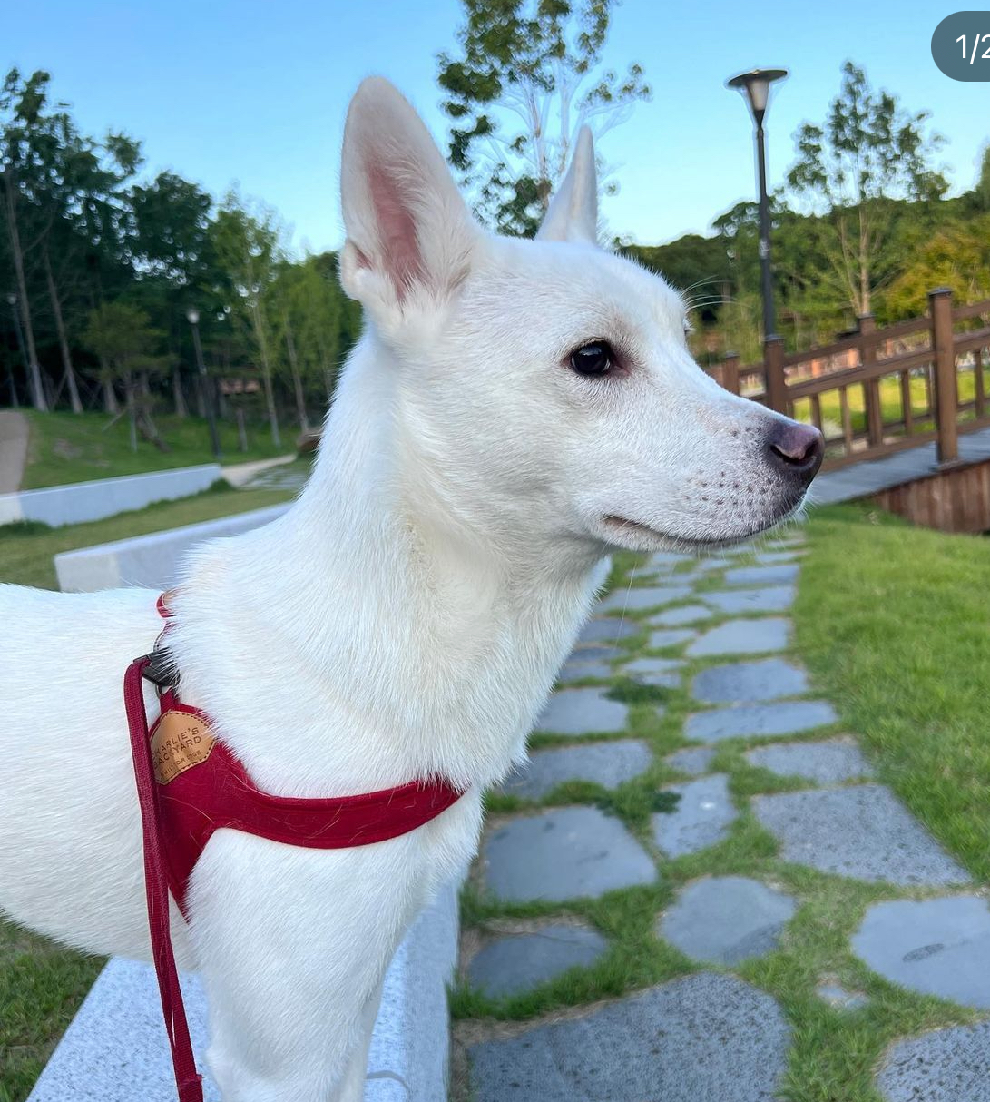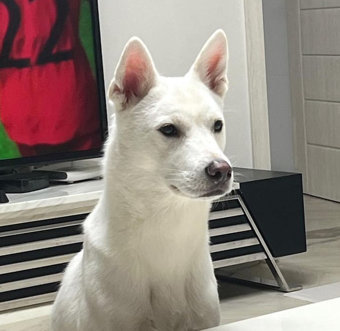 귀가 바짝 서 있고, 남자 어른을 보면 무서워합니다..