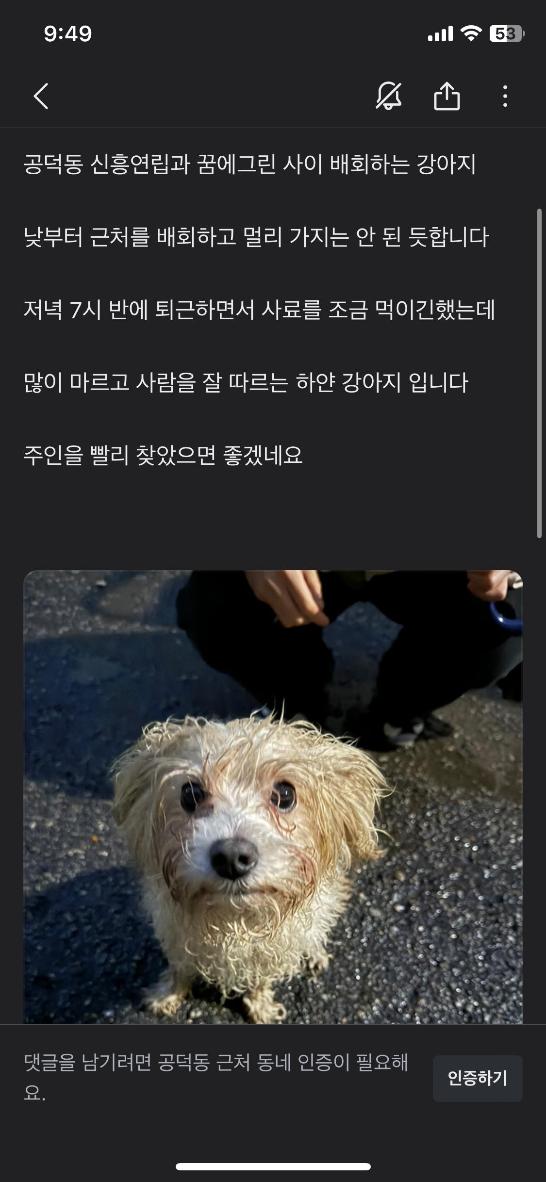 찾아요 🔍강아지 찾아요 서울 () 강아지를 찾습니다. 린다임 2024.04.20 - 23:39 624 이름 보리 종류 및 종 말티푸(믹스견) 분실장소 공덕동 금성출판사 부근 분실 날짜 2024-04-20 성별 수컷(남) 연락처 010-3887-0131 Attached file 강아지를 찾습니다. - 강아지 찾아요 - 유기견 보호 센터 (1) 204.1KB 0 공유 린다임 님의 최근 글 작성 글이 없습니다. 린다임 님의 최근 댓글 작성 댓글이 없습니다. 글쓴이의 작성글 감추기 댓글 쓰기 에디터 사용하기 닫기 글쓴이 비밀번호 댓글 등록 view_headline 목록