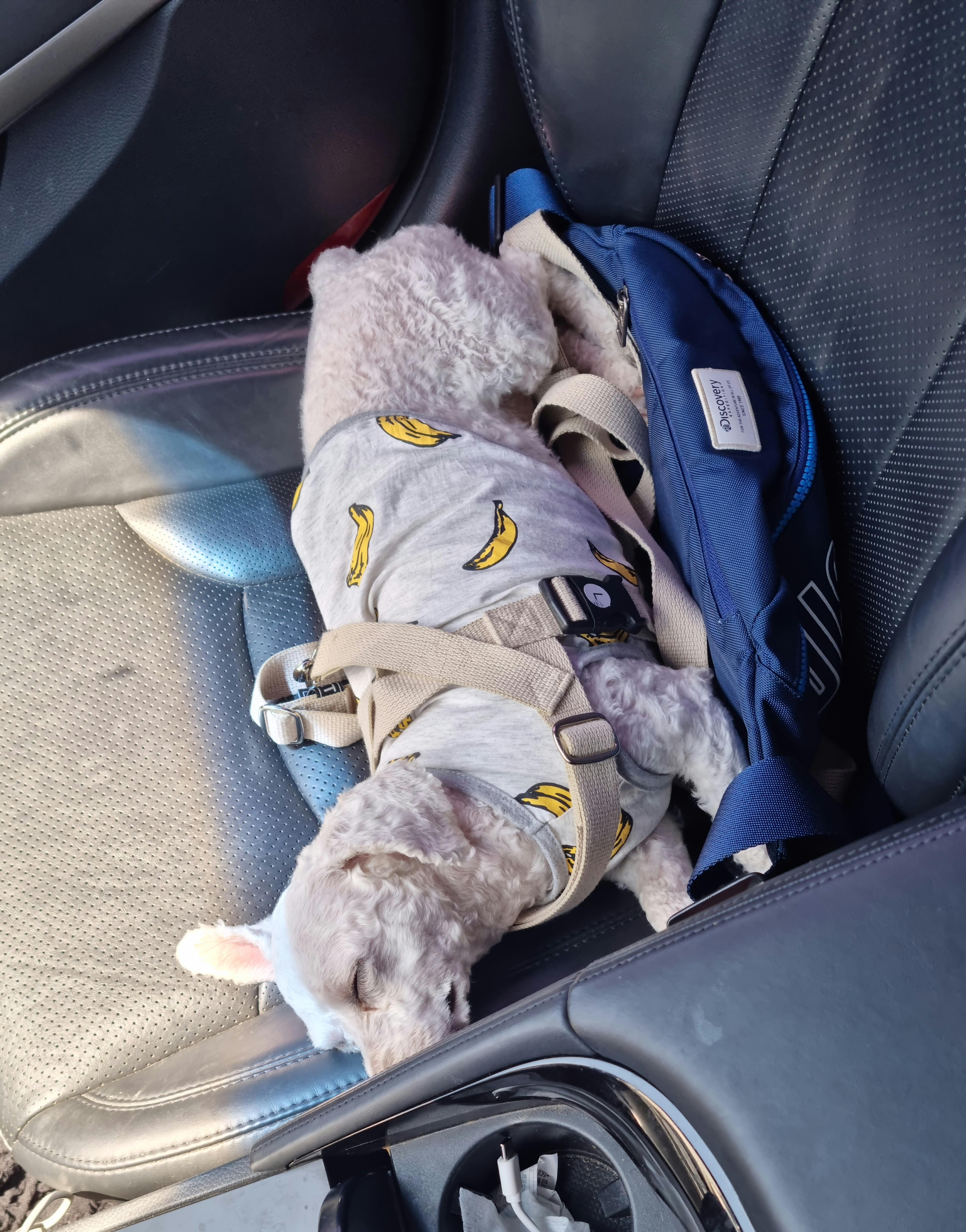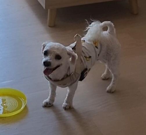 털을 다 민 상태이고 사진처럼 바나나 프린트의 회색티와 베이지색 하네스를 착용하고 있습니다