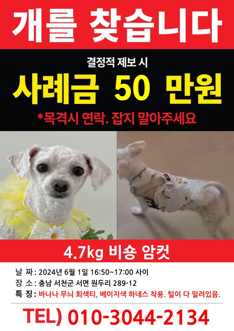 서천군 서면 원두리에서 잃어버린 강아지를 찾습니다