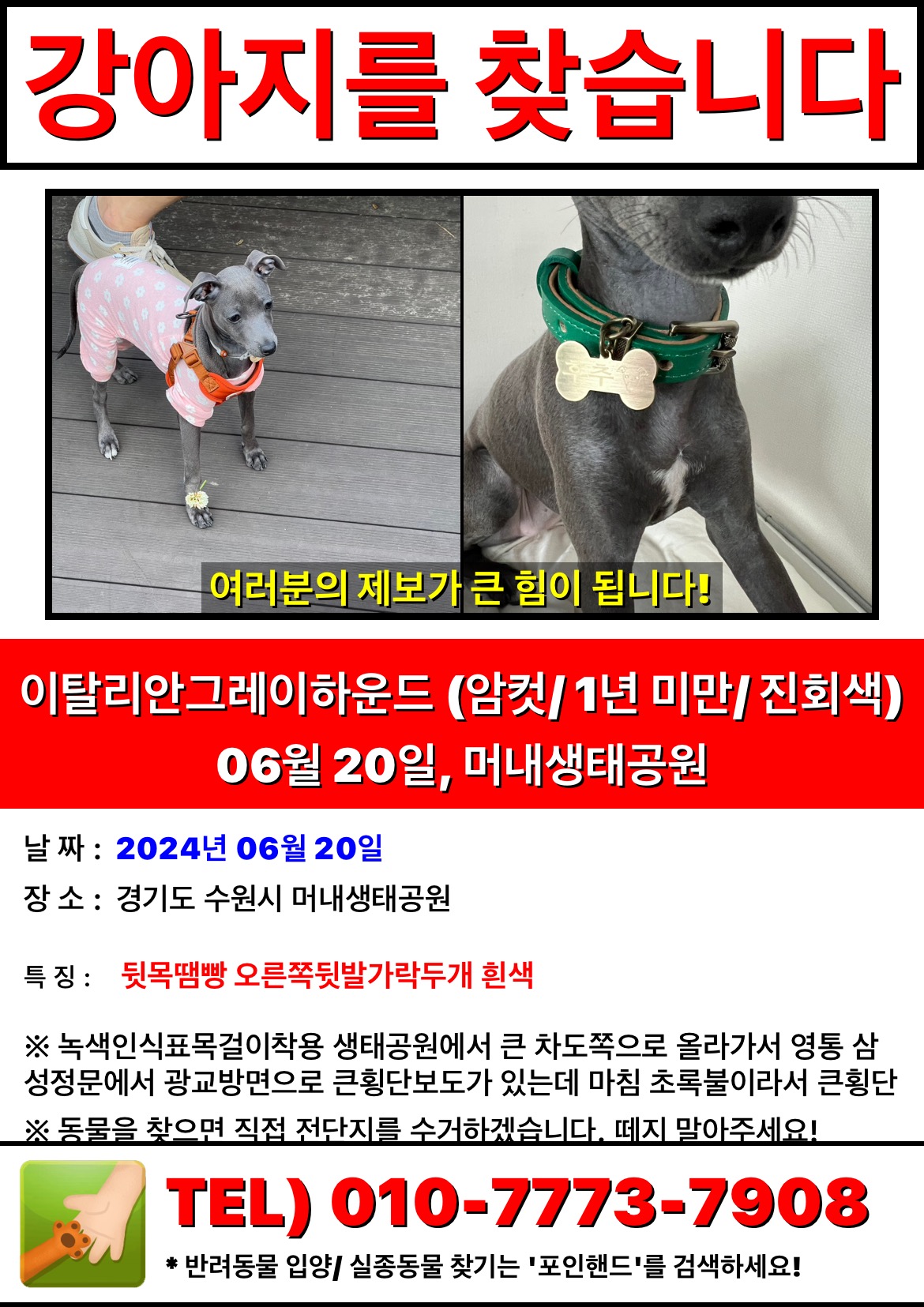 찾아요 🔍강아지 찾아요 경기도 () 후추 찾아주세요 부탁드립니다. OvO77 2024.06.21 - 15:25 701 이름 후추 찾아요 종류 및 종 이탈리안그레이하운드 분실장소 경기도 수원시 머내생태공원 분실 날짜 2024-06-20 성별 암컷(여) 연락처 010-5702-6370 Attached file 후추 찾아주세요 부탁드립니다. - 강아지 찾아요 - 유기견 보호 센터 (1) 506.7KB 1 공유 OvO77 님의 최근 글 작성 글이 없습니다. OvO77 님의 최근 댓글 작성 댓글이 없습니다. 글쓴이의 작성글 감추기 댓글 쓰기 에디터 사용하기 닫기 글쓴이 비밀번호 댓글 등록 view_headline 목록