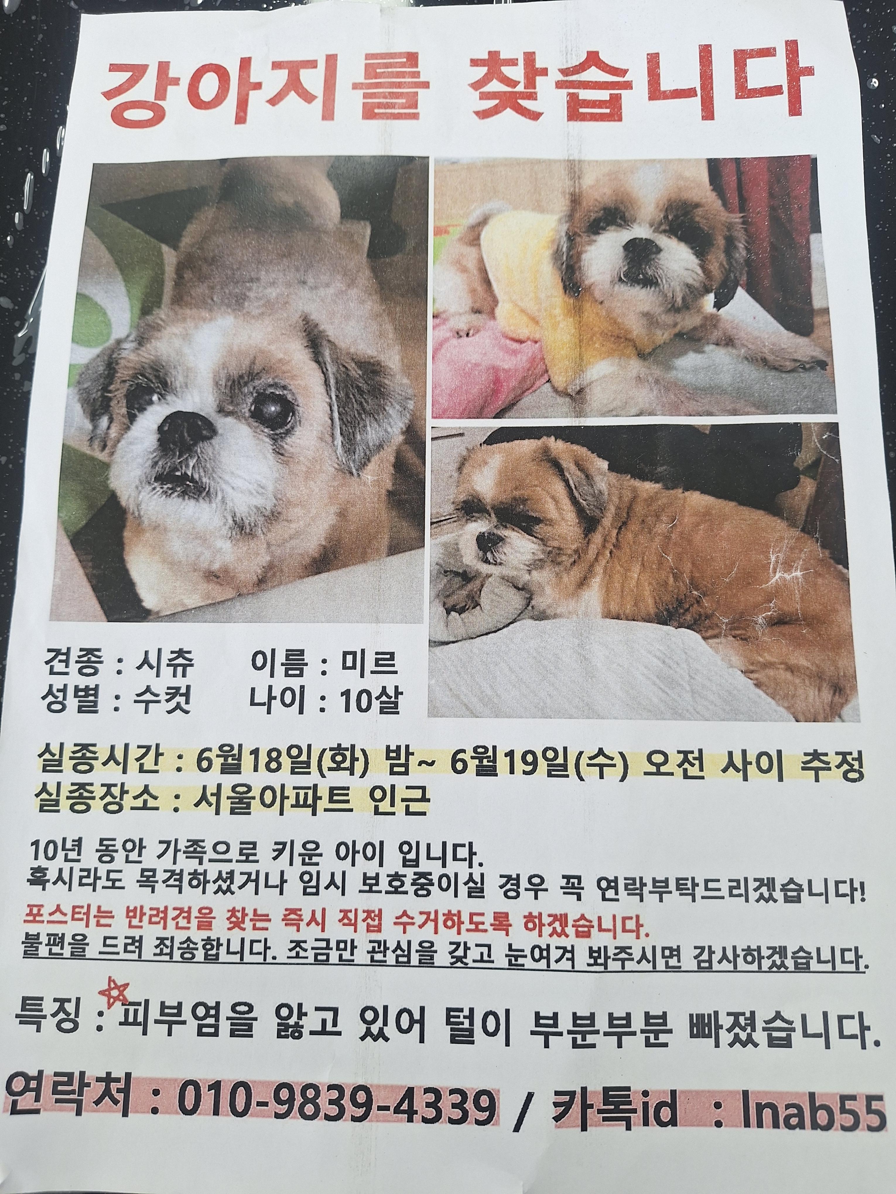 10년동안 가족 같이 키운 아이 입니다 혹시라도 목격하셨거나 임시 보호중이시면 꼭 연락 부탁 드리겠습니다.