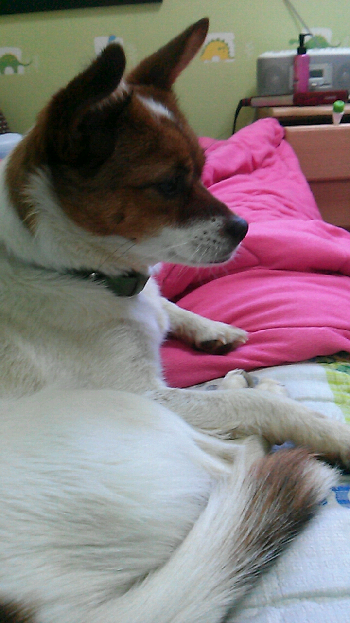 1살 반정도 된 암컷 믹스견인데 전체적으로 하얀털에 얼굴은 갈색이고 꼬리에 검은 점이 있습니다.