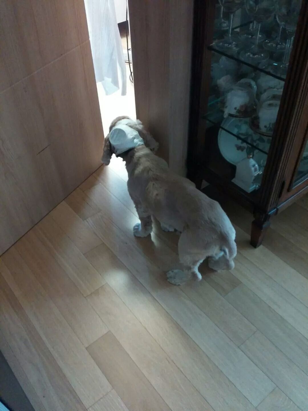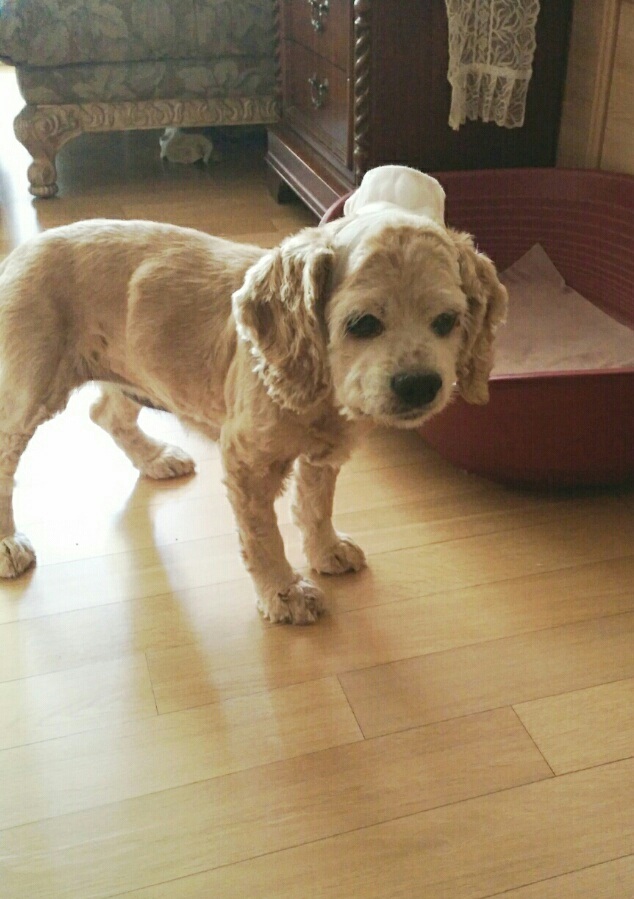 붕대 감고있는 코카스페니얼 찾습니다.
