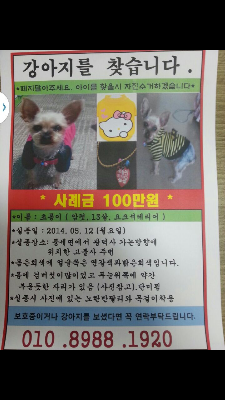 몇일동안 잠도 안자가며 밥도 안먹어가며 찾아보았지만보이지않았어요.. 저희집이 천안시 광덕면 고불사 뒷집인데 그근방에서 아이를 보셨거나 데리고 계신다면 꼭연락부탁드려요 제가 11살에 데려와 정말 제가 힘들때 제곁에항상있었고 친구같고 가족같은 제동생이에요 그런아이가 없어져서 너무 마음이 아픕니다 제발 저희초롱이 12살이라 오래살지못합니다 꼭 남은 생동안 초롱이도 저도 함께할수있게해주세요 몸도 나이가 많아서 아픈곳이 많아요,.. 아직 해주고싶은것도 너무많고 너무 속상합니다 저희초롱이는 저힘들때 항상 있어줬는데 전 그러지 못하고있는거같아서 너무 죄스럽고 보고싶어서 눈물만납니다..저희초롱이는 나갈당시에 노란색반팔티와 목걸이를 차고나갔지만 그건 분실가능성도 있구요, 몸통에 검버섯 그리고 백내장때문에 눈이 약간 회색빛이구요 배쪽에 검은 점박이같은 피부병이있구요 귀가 쫑긋하고 중성화를 안했습니다 제발부탁드립니다 ..
