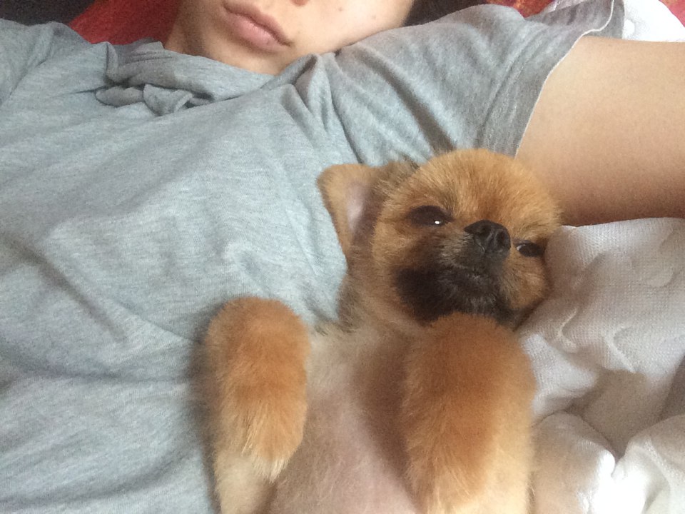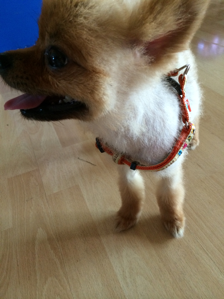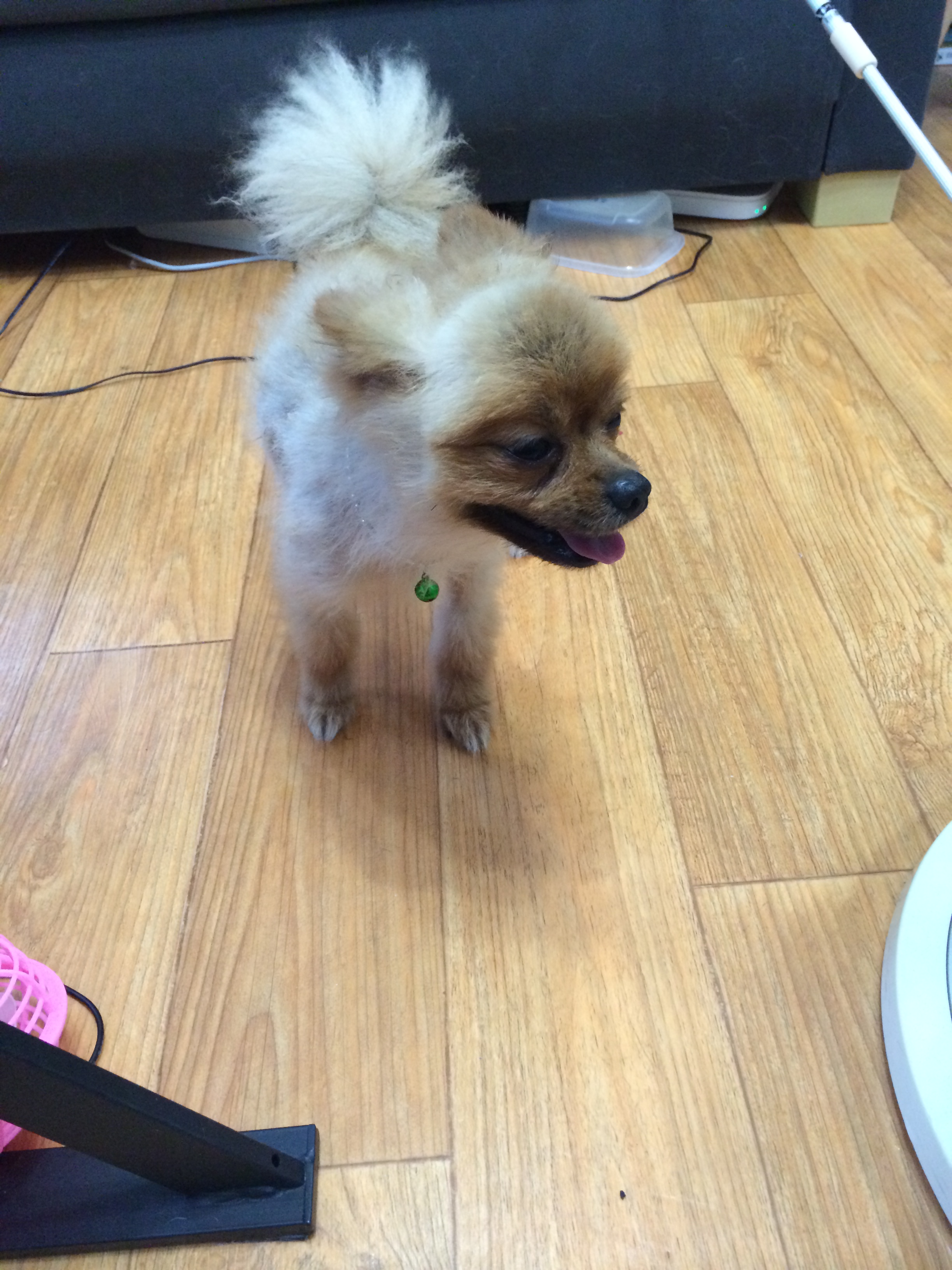 원래 포메라니언이 털이 긴데 더워해서 짧게 밀어놓았구요.