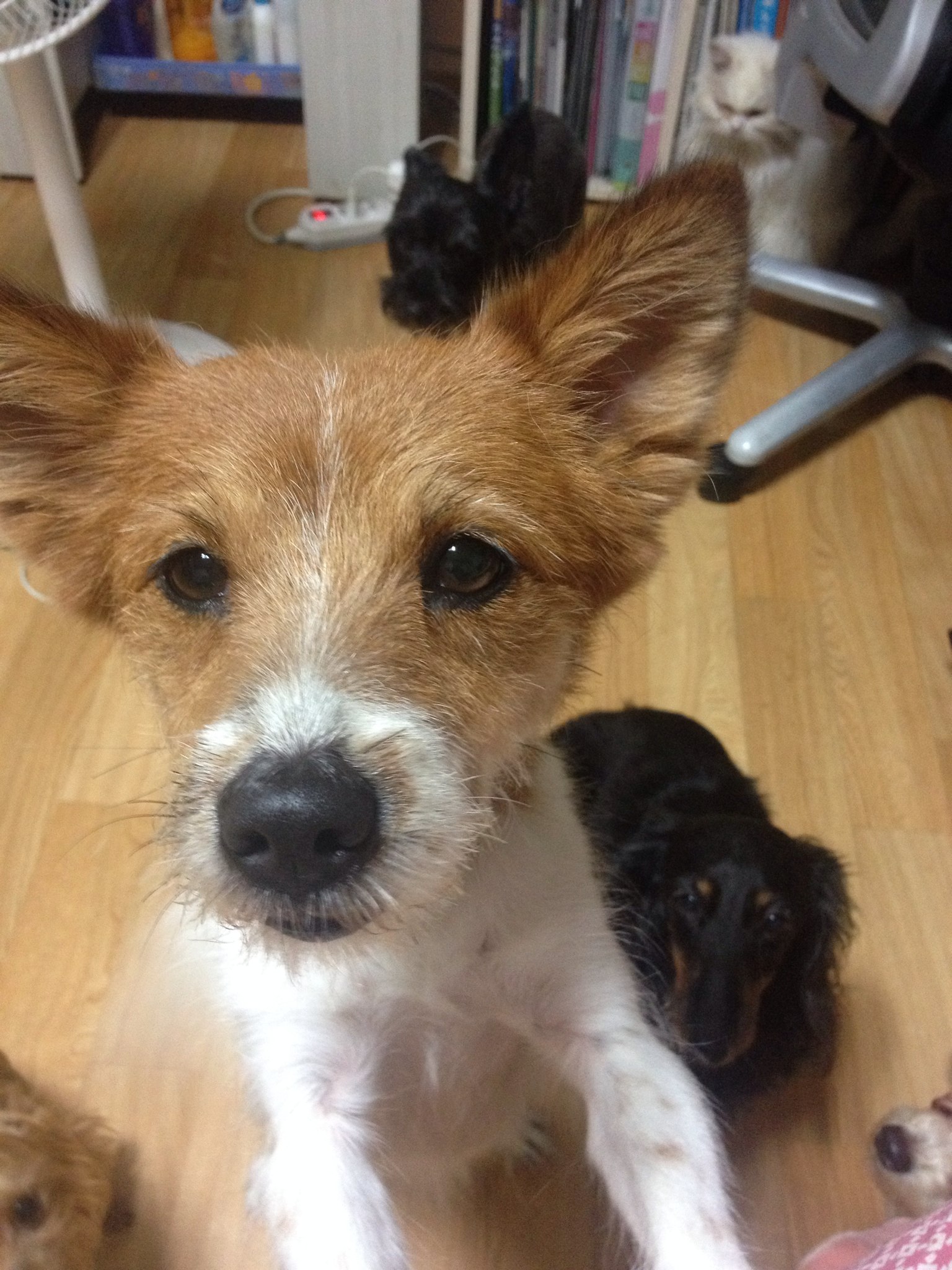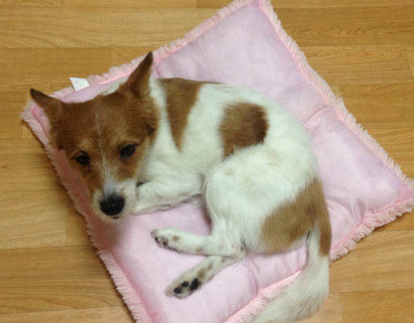 믹스견이며 하얀색 바탕에 누런색 얼룩 무늬 가 있습니다. 겁이 많아 남자에게는 잘 안갑니다.