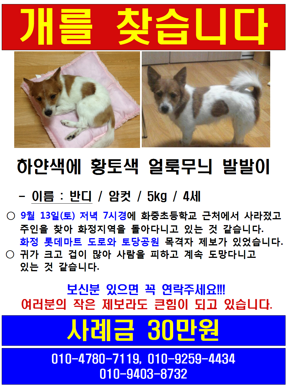 여러분의 제보가 힘이 됩니다. 혹시 보호하고 계신 분이나 개를 목격하신 분들은 꼭 연락 주시기 바랍니다.