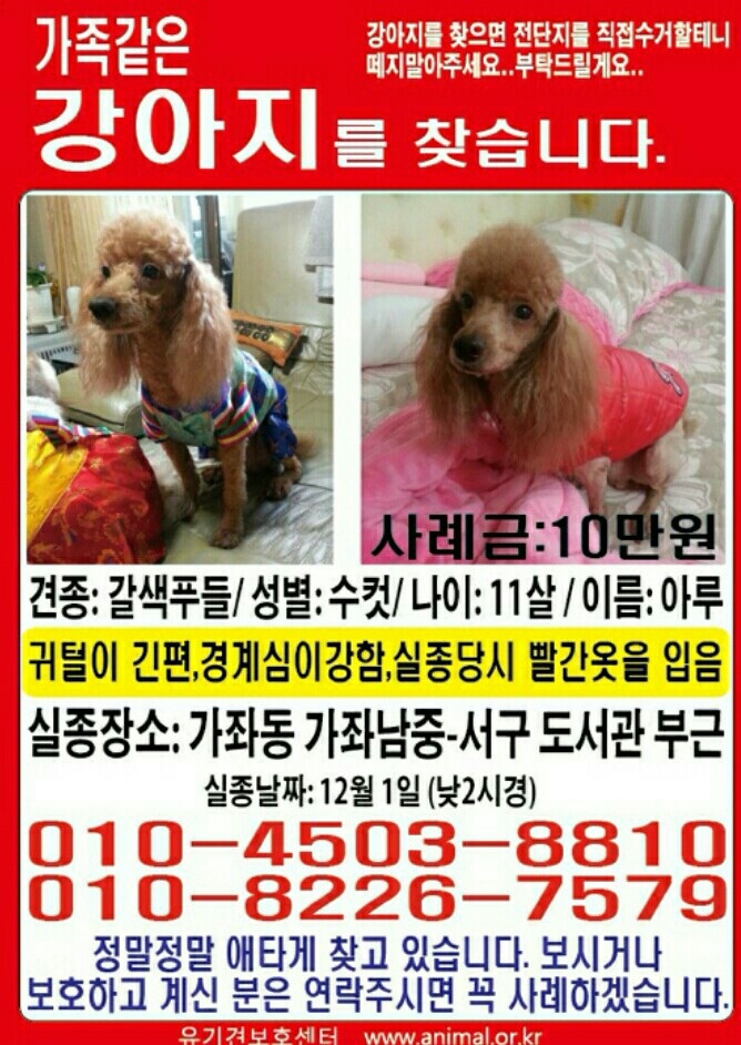 푸들치고는 크기가 크며 남자아이입니다 오줌을 옥상에나가 볼일보는 버릇이있어 볼일볼시간이되서 문을 열어주엇더니 아루혼자 옥상으로 올라가 볼일을보고 집으로 돌아오는데 이날은 할머니뿐이 안계셨고 엄마는 장보러 시장을가셔서 안계셨거든요 아마 아루가 엄마찾으러 집에안들어온거같습니다 빨간색 옷을 입고 나갔습니다 나이가 있어 몸 몇군데군데 뾰루지같은것도 나있고 피를 한번 흘리면 멈추지않는병?을 앓고잇어 중성화 수술도 못시켰습니다 지금 밖에 너무춥고 벌벌떨생각하면 눈물부터나옵니다 크기도 크고 카리스마있어보여도 순하고 착한강아지입니다 비슷한 강아지보시면 연락주세요
