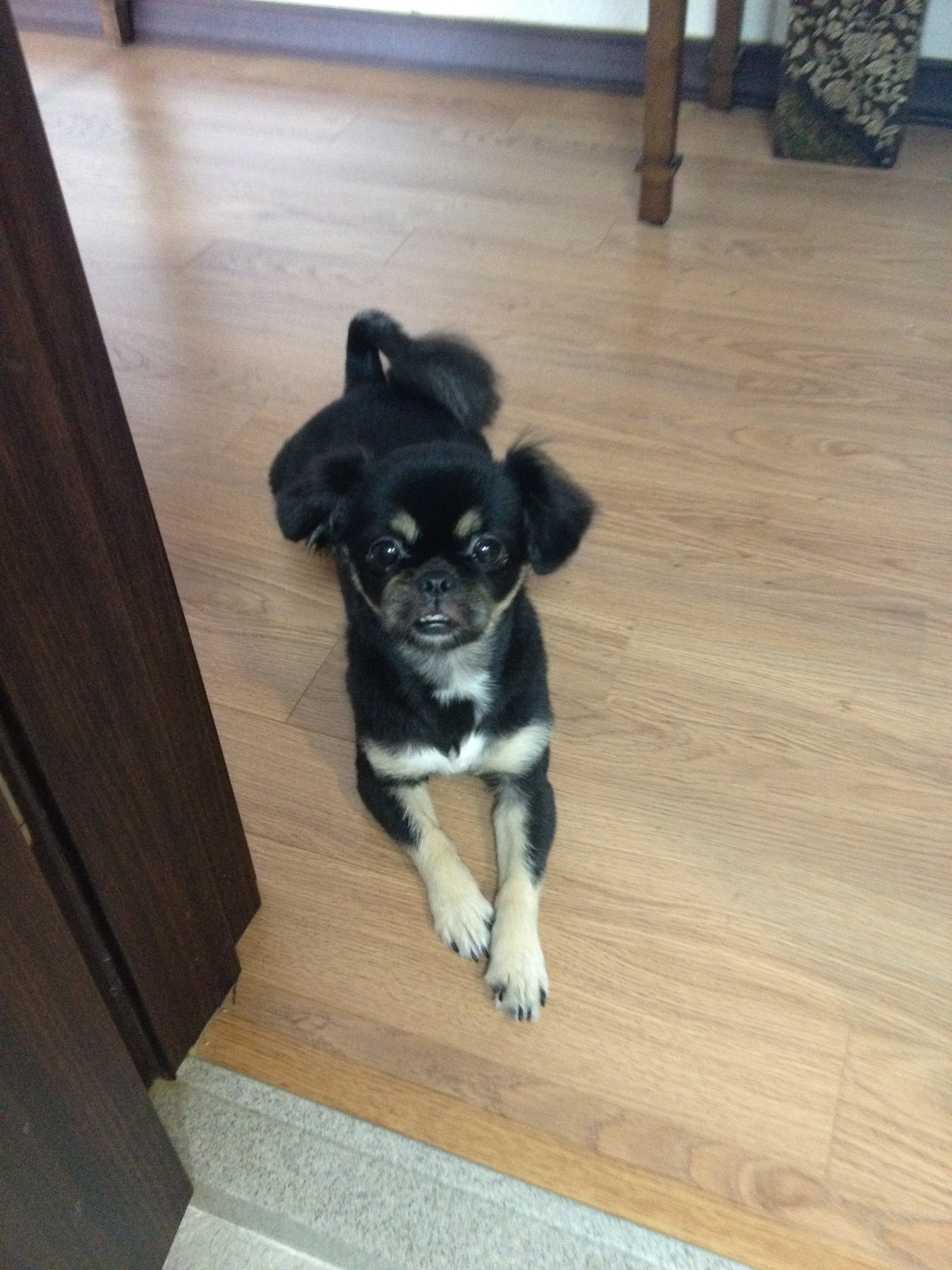 검정털과 황토색 눈썹, 가슴에 하얀 털이 특징. 따뜻한 곳을 좋아하여 가랑이사이를 좋아함.
