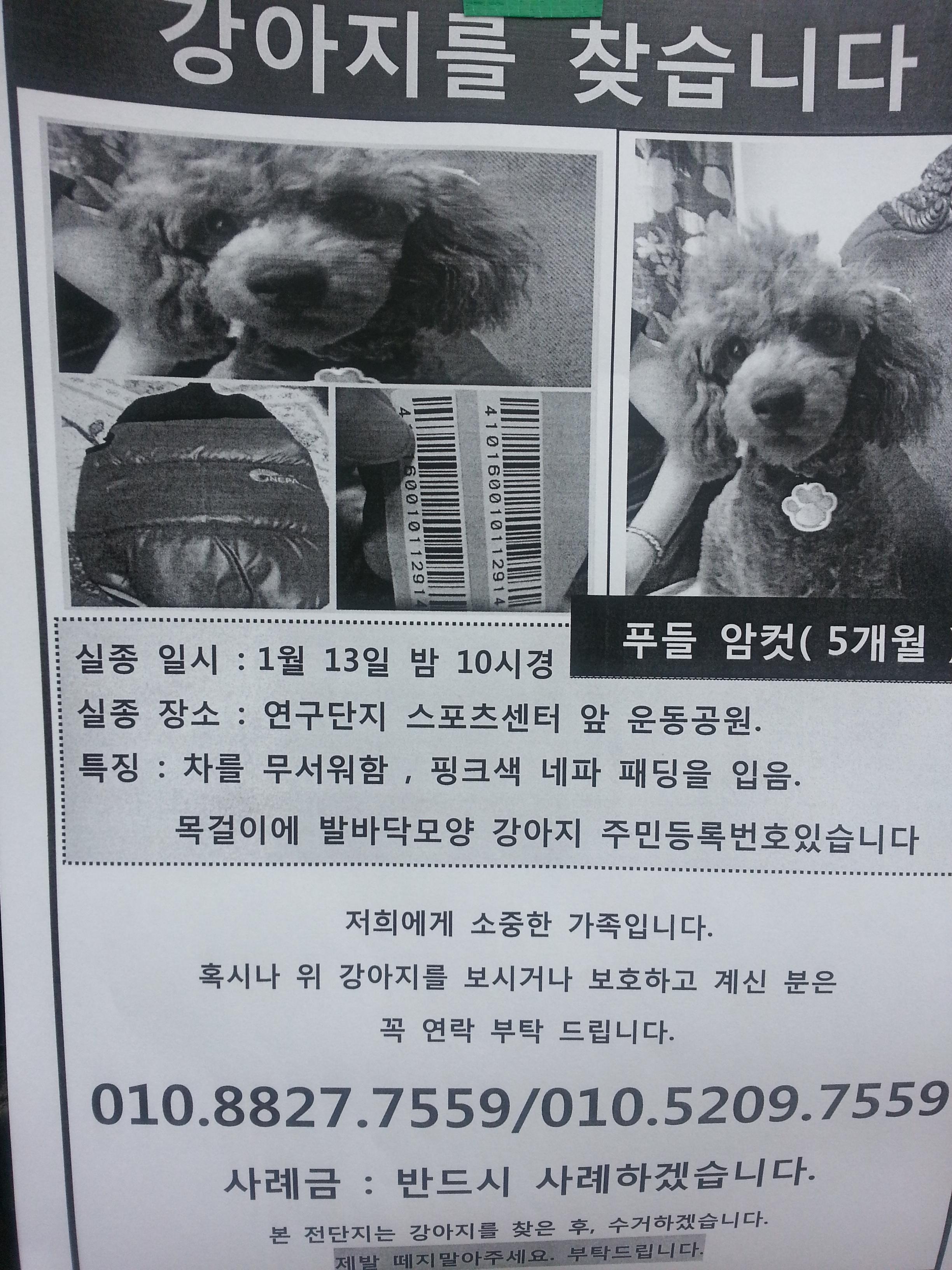 찾아요 🔍강아지 찾아요 대전 () 유성구 도룡동 연구단지 스포츠센터옆 운동공원 dhtmdrbs1 2021.07.04 - 12:17 2015.01.14 - 19:17 1162 꼬리 3센치에 네파패딩을입엇습니다. 1월13일 화요일 밤10시경 연구단지 스포츠센터 옆 운동공원에서 사라졋습니다 연구단지 사거리나 늘픔(교수아파트)쪽으로 간것으로 추정됨니다. 제발 저의집 막내를 찾아주세요. Attached file 유성구 도룡동 연구단지 스포츠센터옆 운동공원 - 강아지 찾아요 - 유기견 보호 센터 (1) 914.2KB 40 유성구 도룡동 연구단지 스포츠센터옆 운동공원 - 강아지 찾아요 - 유기견 보호 센터 (2) 651.1KB 31 유성구 도룡동 연구단지 스포츠센터옆 운동공원 - 강아지 찾아요 - 유기견 보호 센터 (3) 647.3KB 29 공유 dhtmdrbs1 님의 최근 글 작성 글이 없습니다. dhtmdrbs1 님의 최근 댓글 작성 댓글이 없습니다. 글쓴이의 작성글 감추기 댓글 쓰기 에디터 사용하기 닫기 글쓴이 비밀번호 댓글 등록 view_headline 목록