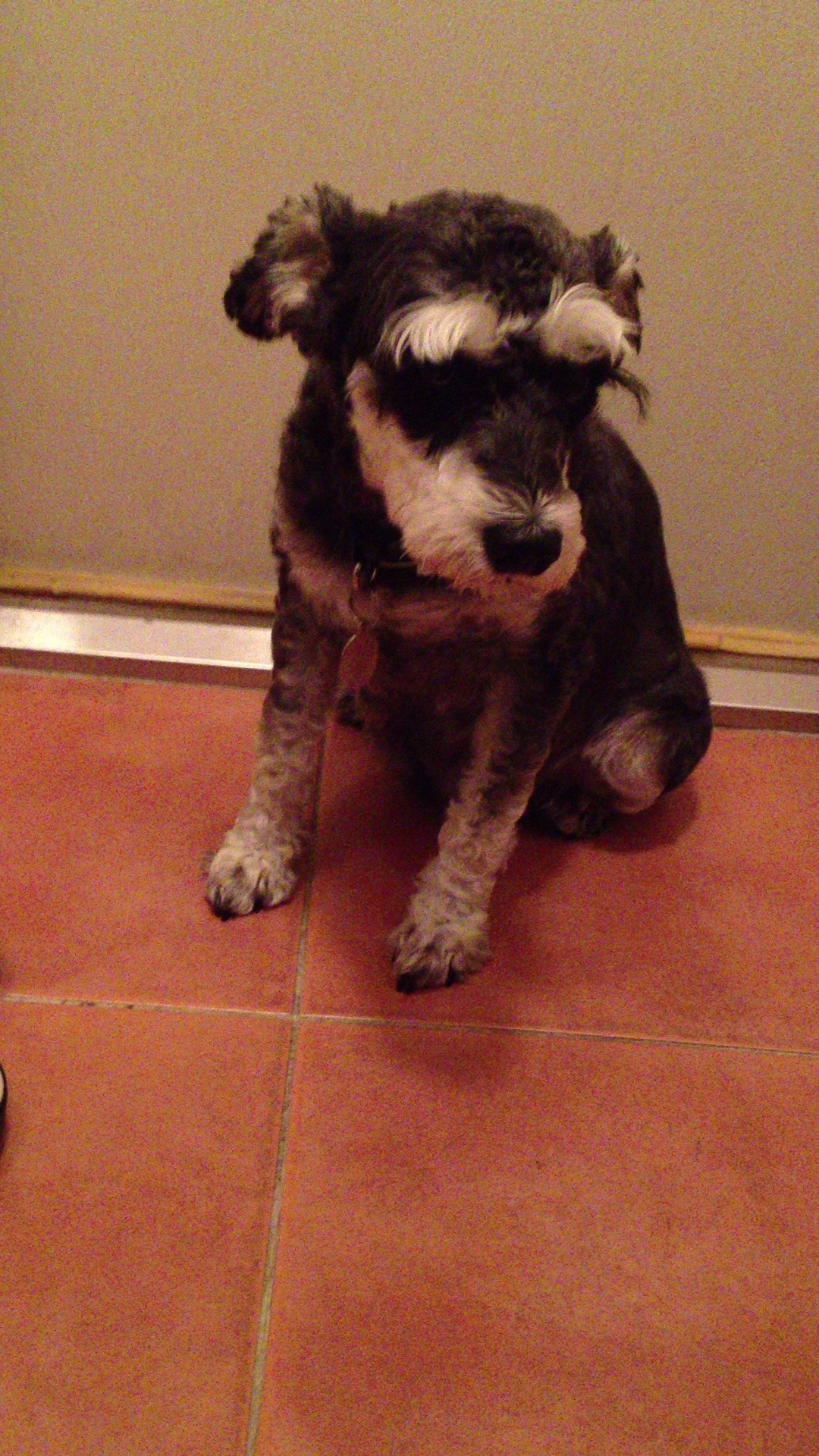 8살된 암컷 슈나우저이며 파란색 목줄을 착용하고 있으며
