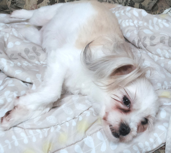 다리는 흰색이구요 꼬리는 싹 밀었어요 또, 등은 흰색과 연한 갈색이 섞여있습니다