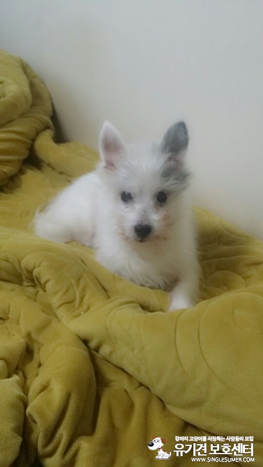 전체적으로 흰색, 왼쪽귀가 까만색이고 꼬리앞에 까만 털이 조금있습니다.