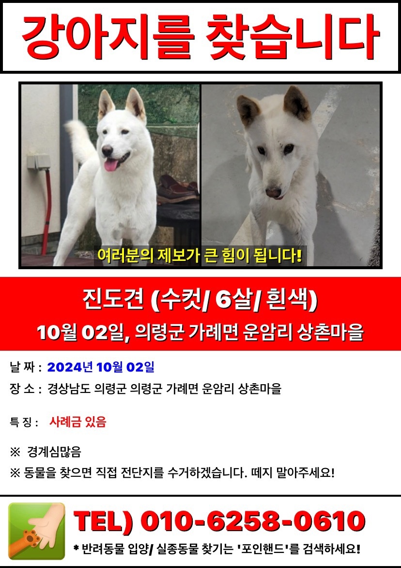 찾아요 🔍강아지 찾아요 경남 () 진돗개 구름이를 찾습니다 상촌구름 2024.10.05 - 10:36 1100 이름 구름이 종류 및 종 진도견 분실장소 의령군 상촌마을 분실 날짜 2024-10-02 성별 수컷(남) 연락처 010-6258-0610 Attached file 진돗개 구름이를 찾습니다 - 강아지 찾아요 - 유기견 보호 센터 (1) 236.9KB 3 공유 상촌구름 님의 최근 글 작성 글이 없습니다. 상촌구름 님의 최근 댓글 작성 댓글이 없습니다. 글쓴이의 작성글 감추기 댓글 쓰기 에디터 사용하기 닫기 글쓴이 비밀번호 댓글 등록 view_headline 목록