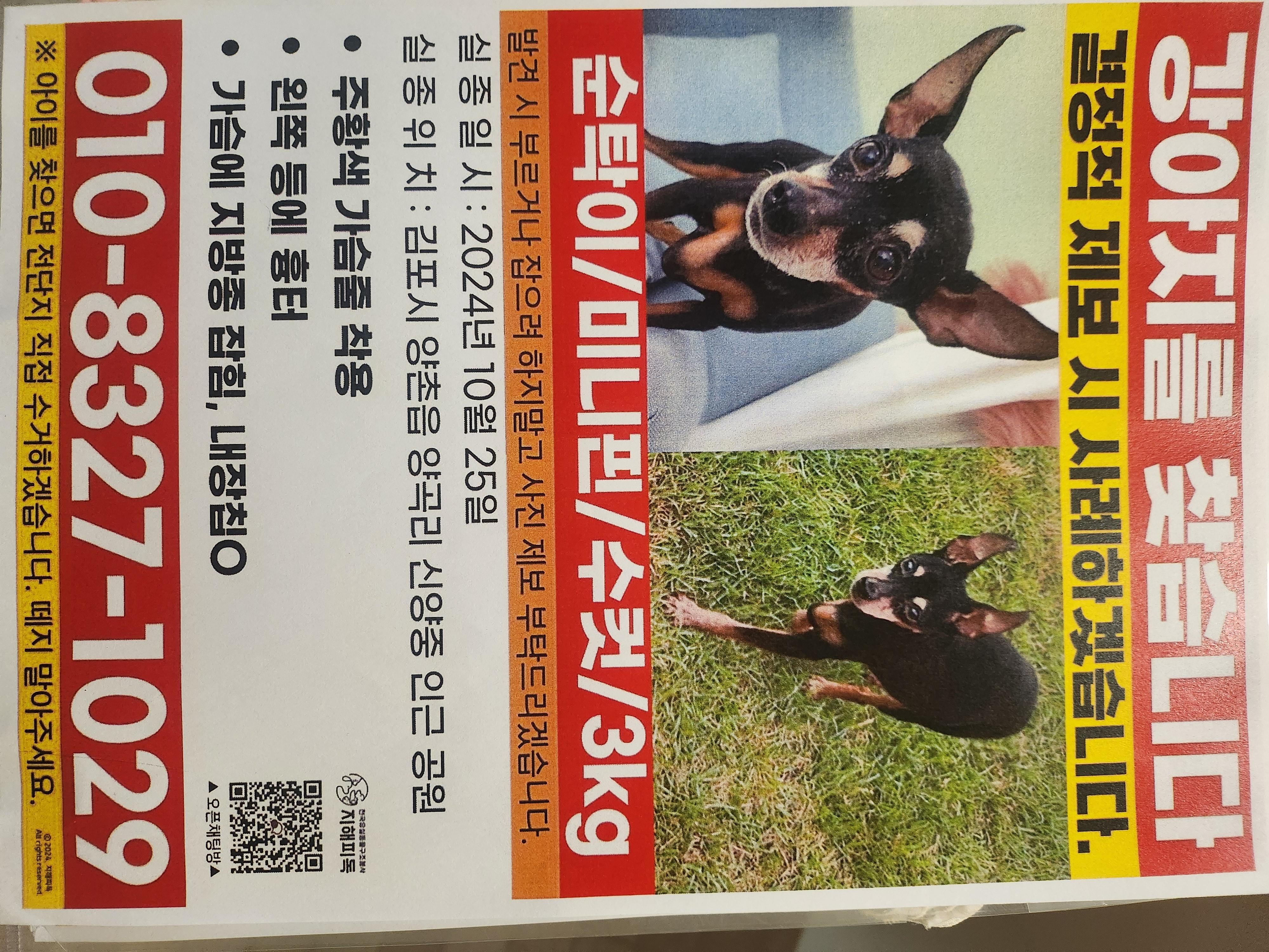 찾아요 🔍강아지 찾아요 경기도 () 미니핀 찾습니다 순탁이 2024.10.29 - 12:50 316 이름 순탁이 종류 및 종 미니핀 분실장소 양곡2단지 3잔지 사이 공원 분실 날짜 2024-10-25 연락처 ***-5580-1029 14살 미니핀 애타게 찾고있습니다 경계심이 많은 아이라 짖을수도 있습니다 주황색 하네스 착용하고 있어요 Attached file 미니핀 찾습니다 - 강아지 찾아요 - 유기견 보호 센터 (1) 1.81MB 7 공유 순탁이 님의 최근 글 작성 글이 없습니다. 순탁이 님의 최근 댓글 작성 댓글이 없습니다. 글쓴이의 작성글 감추기 댓글 쓰기 에디터 사용하기 닫기 글쓴이 비밀번호 댓글 등록 view_headline 목록