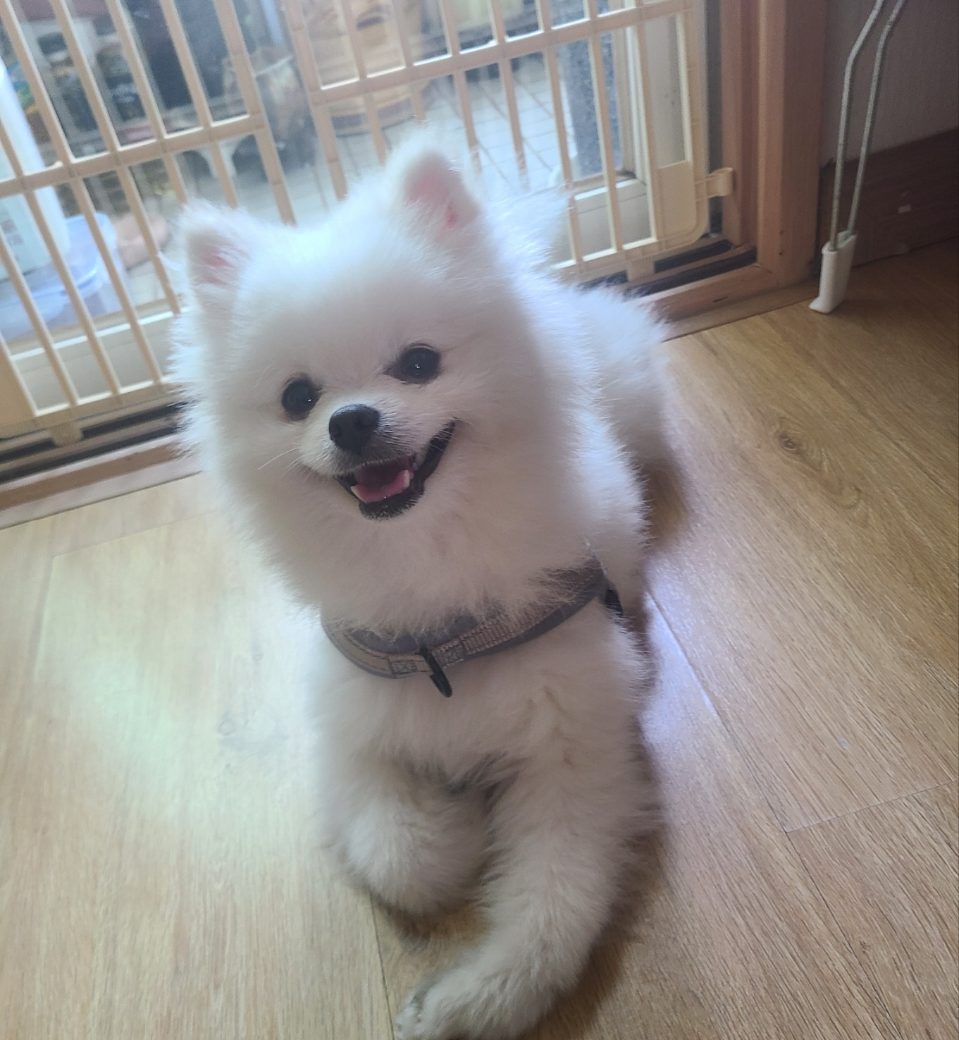 특징: 하얀색, 포메치고는 긴 다리, 큰 덩치, 겁이 많고 제자리서 빙글빙글 돌고는 합니다.