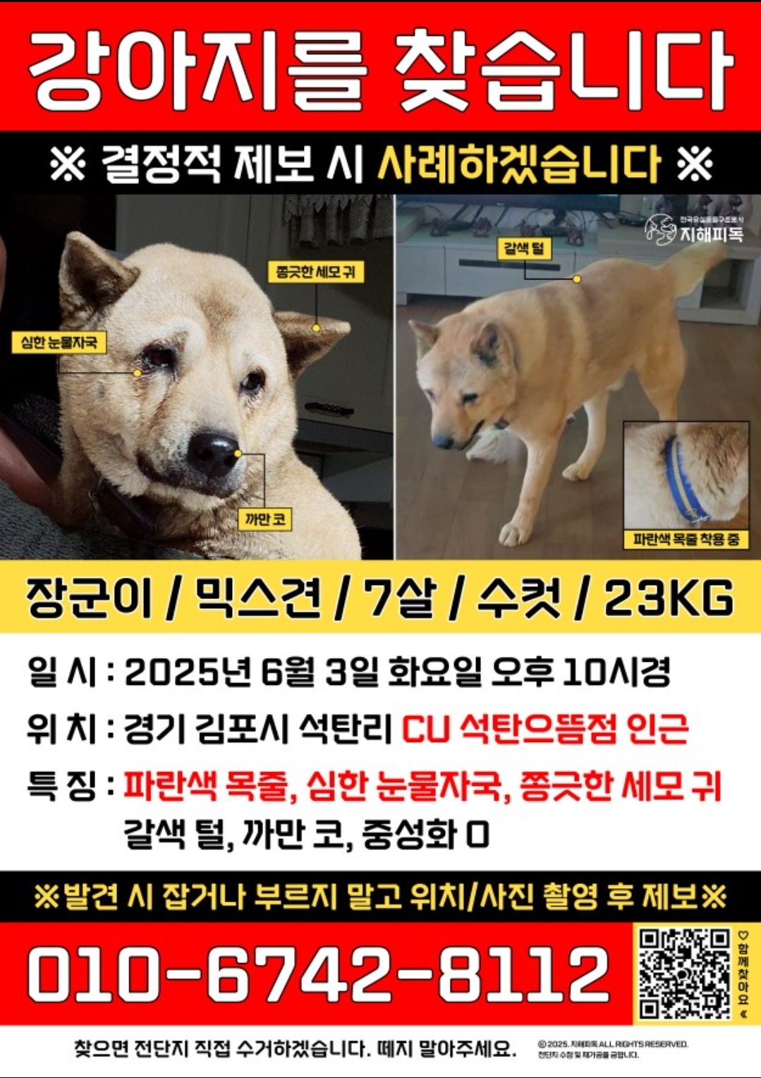 김포 하성면 석탄 3리 에서 2025/06/03 10시 경에 집을 나가서 아직 돌아오지 않았어요. 꼭 좀 부탁드리겠습니다.