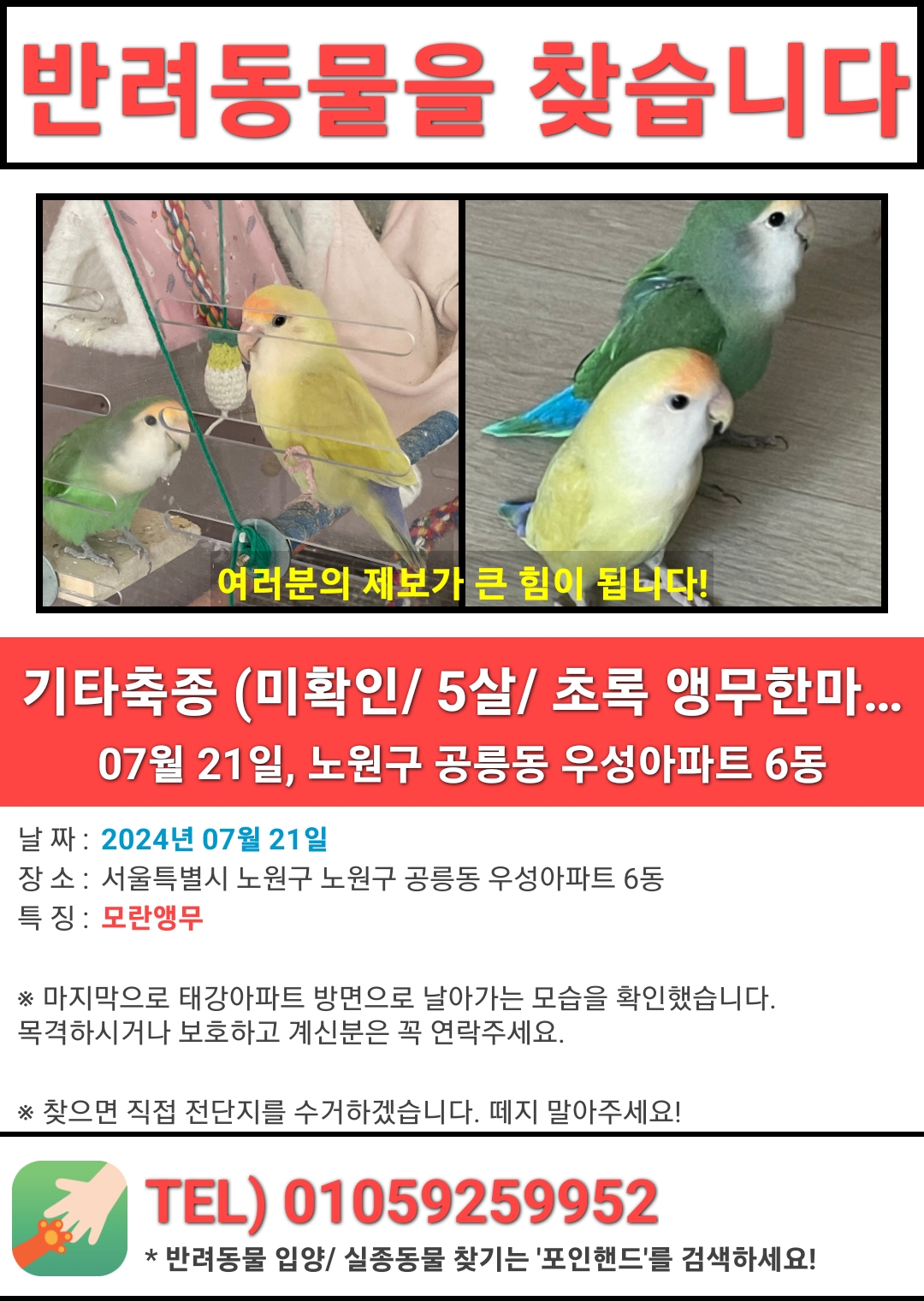 찾아요 🔍그 외 동물 찾아요 (공릉동) 노란색, 초록색 모란앵무를 찾습니다. 잭도사 2024.07.21 - 19:49 2024.07.21 - 19:49 526 이름 사랑 종류 및 종 앵무새/모란앵무 분실장소 서울특별시 노원구 노원로29, 공릉동 분실 날짜 2024-07-21 성별 수컷(남) 연락처 010-5925-9952 Attached file (공릉동) 노란색, 초록색 모란앵무를 찾습니다. - 앵무새,파충류,소동물 찾아요 - 유기견 보호 센터 (1) 686.6KB 2 공유 잭도사 님의 최근 글 작성 글이 없습니다. 잭도사 님의 최근 댓글 작성 댓글이 없습니다. 글쓴이의 작성글 감추기 댓글 쓰기 에디터 사용하기 닫기 글쓴이 비밀번호 댓글 등록 view_headline 목록