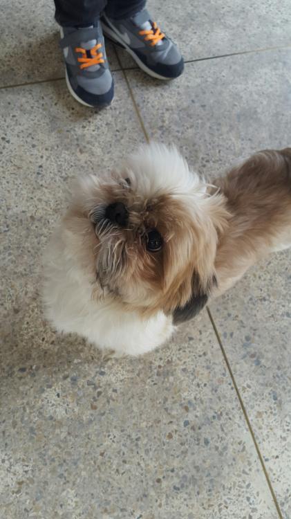 점심시간에 아파트 앞에서 발견한 시츄에요. 정확하진 않지만 남아인것 같았고요. 성견으로 보였습니다.