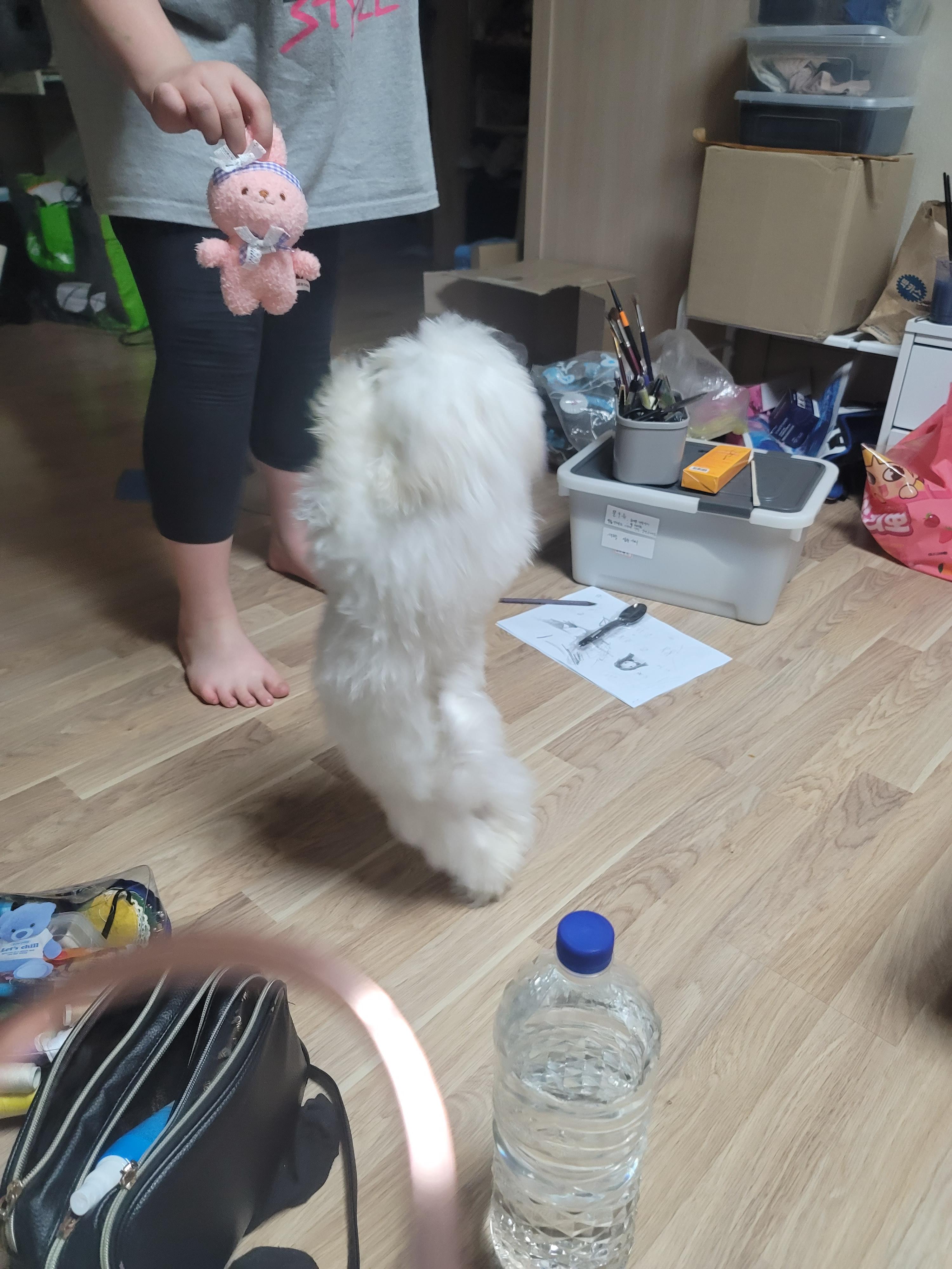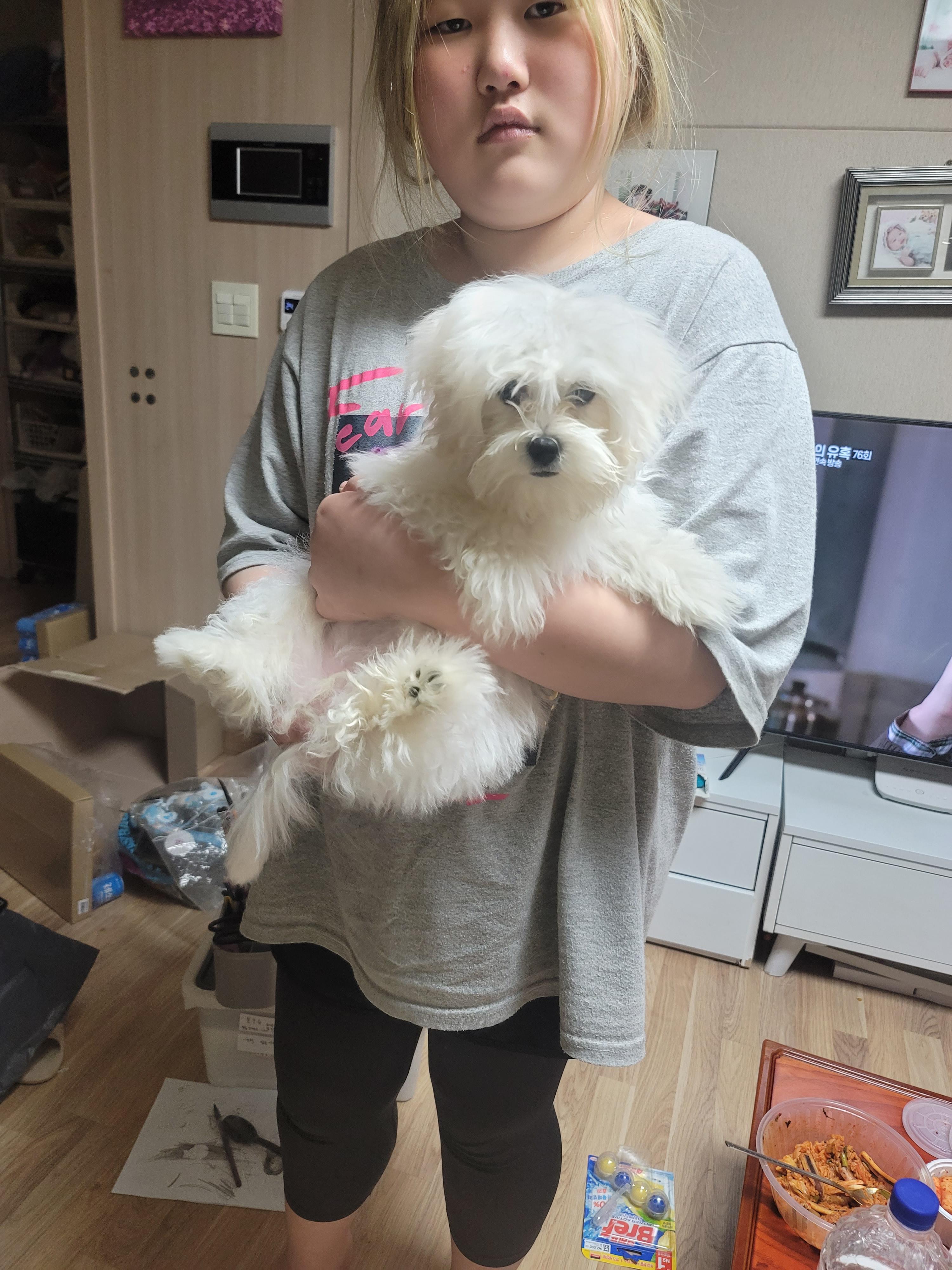 우리딸이 친구랑 공원에서 놀다가, 어떤 모자쓰고 마스크 쓴 여자가 벤치쪽 구석에 내려놓고 갔는데, 한시간 가량 오지 않아 저에게 전화를 해서 가보니, 강아지가 사람을 잘 따르더라고요. 경찰서에 신고하고, 임시 보호 하겠다고 데려왔어요. 저는 개를 키우지 않았어서 , 간단하게  필요한 용품만 샀어요. 애교많고, 활발하고, 안아주면 가만히 있어요. 산책훈련이 안된것 같아요. 용변은 첫날엔 아무것도 없어 거실에 여기저기 싸더니, 어제 배변패드 깔아주니, 바닥에 안싸고 패드에만 소변,대변 잘 싸요.