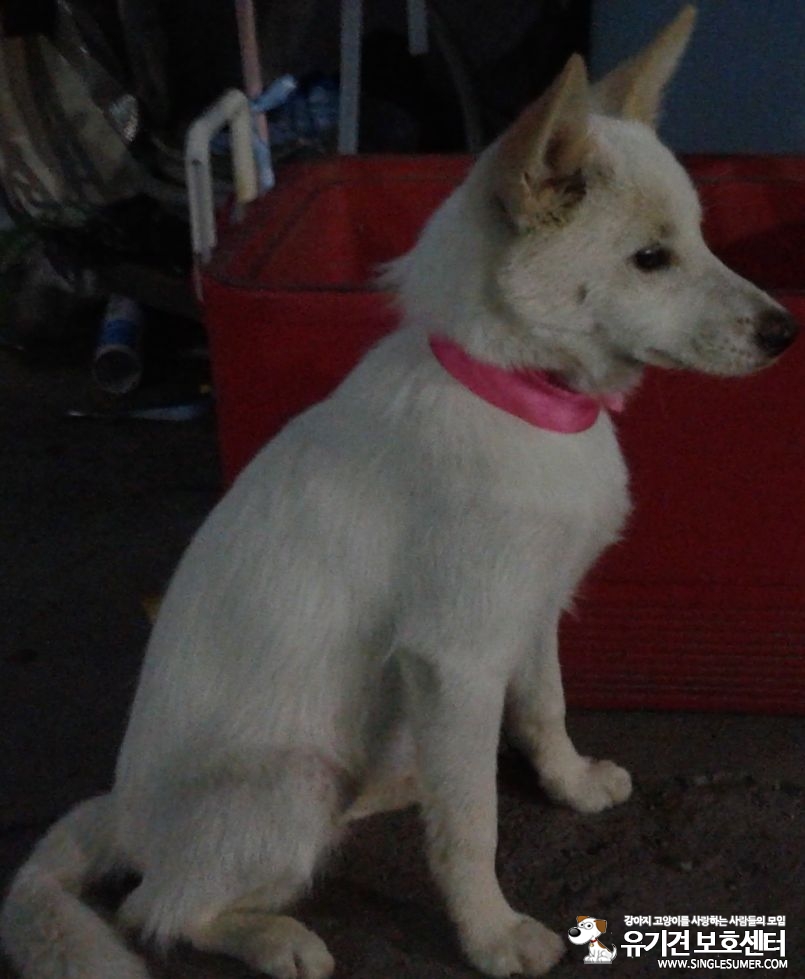 전체적으로 흰색. 암컷..머리와 엉치위에 갈색털.. 송탄 지산동에서 발견..순하고 아이들을 잘 따름..