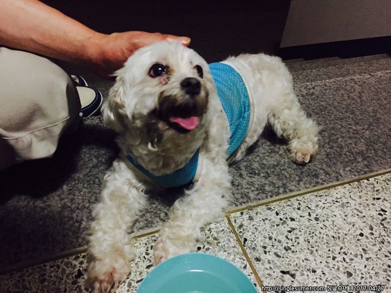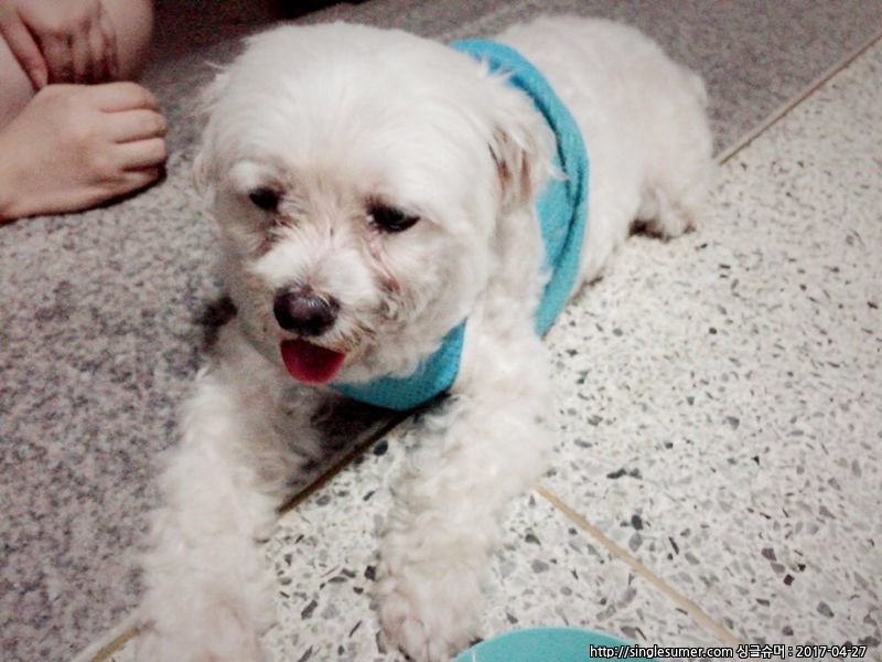 말티즈 종류로보이며 남자아이이고 발견당시에 하늘색 아디다스 여름용 애견옷을 입고있었습니다