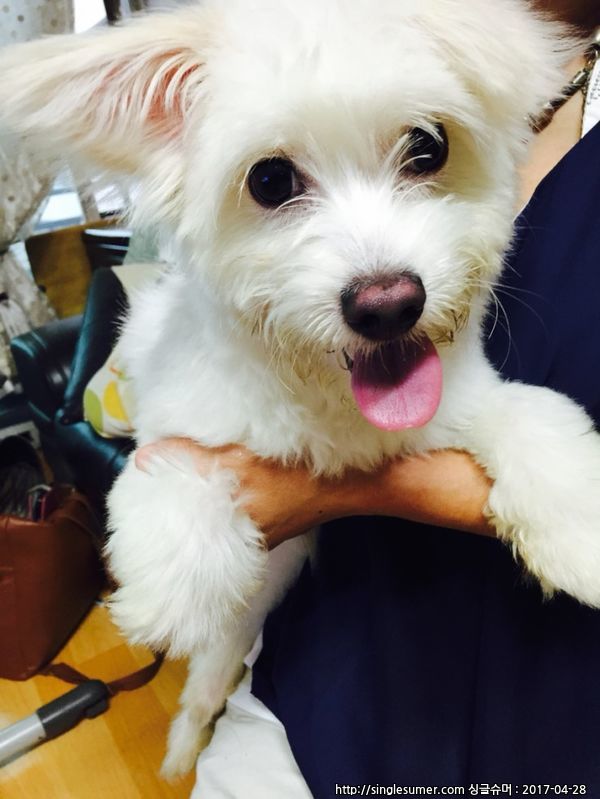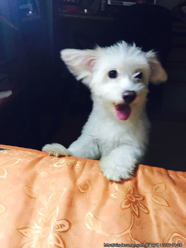흰색 믹스견으로 한쪽 귀가 접혀있습니다.